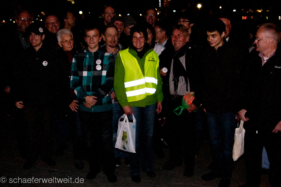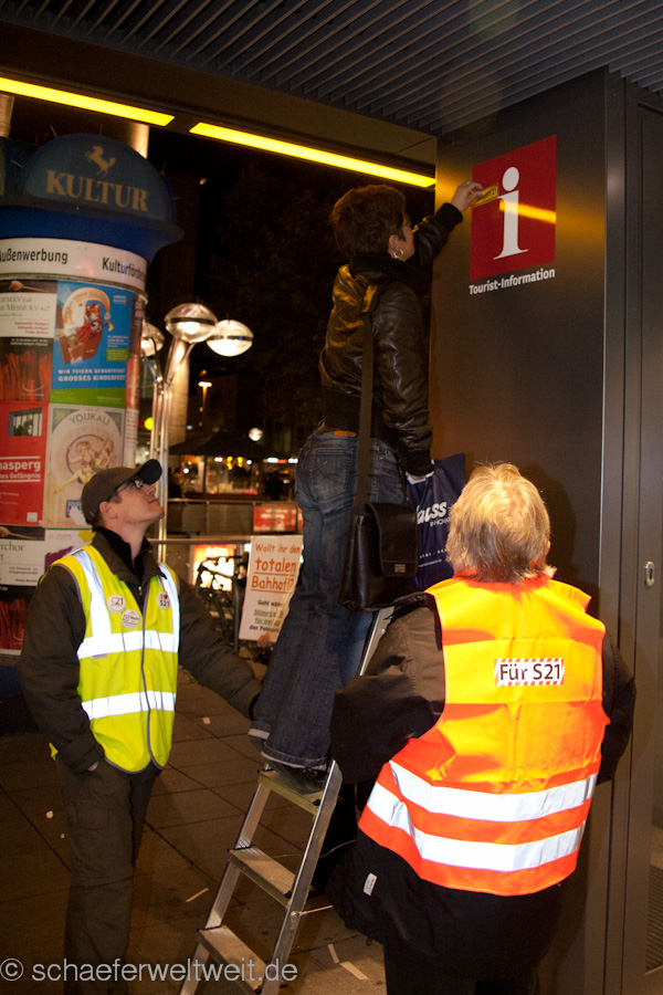 Nach der Montagsdemo ging ich vom Schloßplatz richtig I-Punkt an dem sich die IG-Bürger gegen 19:30 treffen wollten. Die IG hatte sich dort mit Tanja Gönner verabredet. Ich begann Kontakt aufzunehmen um über die Aktion berichten zu können. Aufgrund der in Richtung HBF heimziehenden S21Gegner, wurde dieses Treffen mit T. Gönner Zeitlich sowei räumlich verlegt (Aussage IG-Bürger) zuerst hieß es an den Marktplatz.
