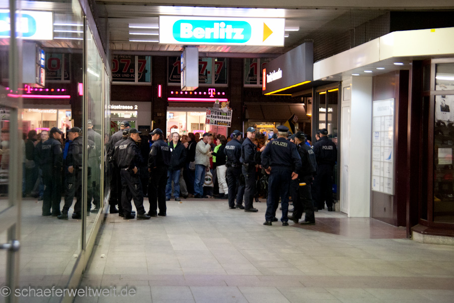 Als dann die Polizei eintraf und versuchte die Parteien zu trennen, zog sich ein Teil der IG auf die Königstraße zurück, ein anderer Teil Richtung Hotel „Am Schloßgarten“. Am I-Punkt wurden die S21Gegner von der Polizei gebunden bzw. von der IG-Bürger getrennt. Ich ging mit der Gruppe bis zum Schloßplatz mit, wo diese auf abgetrennten Mitglieder und Tanja Gönner wartete.