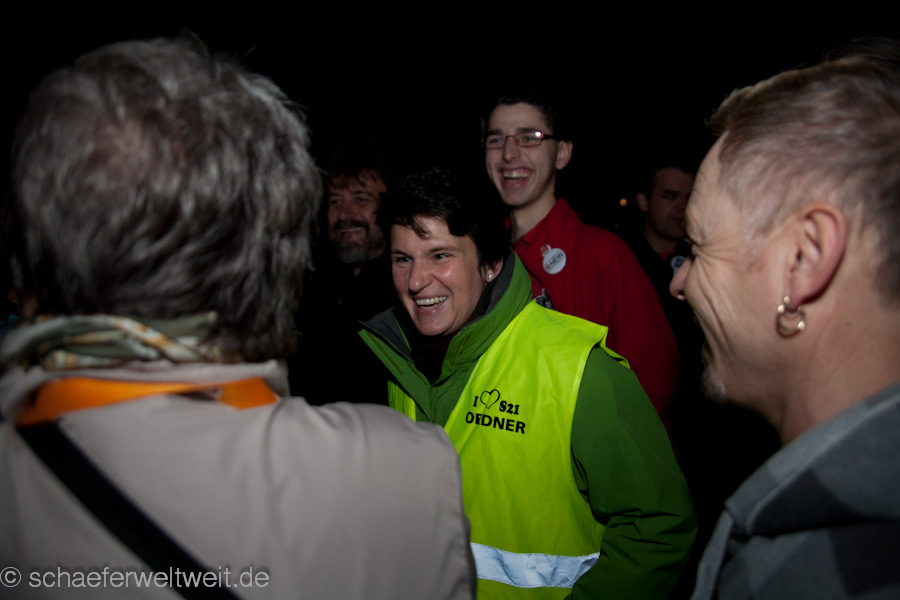 Die Polizeiketten ließen die IG-Bürger zum Landtag durch. Dort angekommen zogen sie ihre Westen aus und trafen sich mit Tanja Gönner. Diese Bedauerte sehr, dass es wohl doch nicht zum abkratzen kommen könne und lud dann, nach einem Gruppenbild für die Presse, die IG-Bürger ins Plenum im Landtag ein.