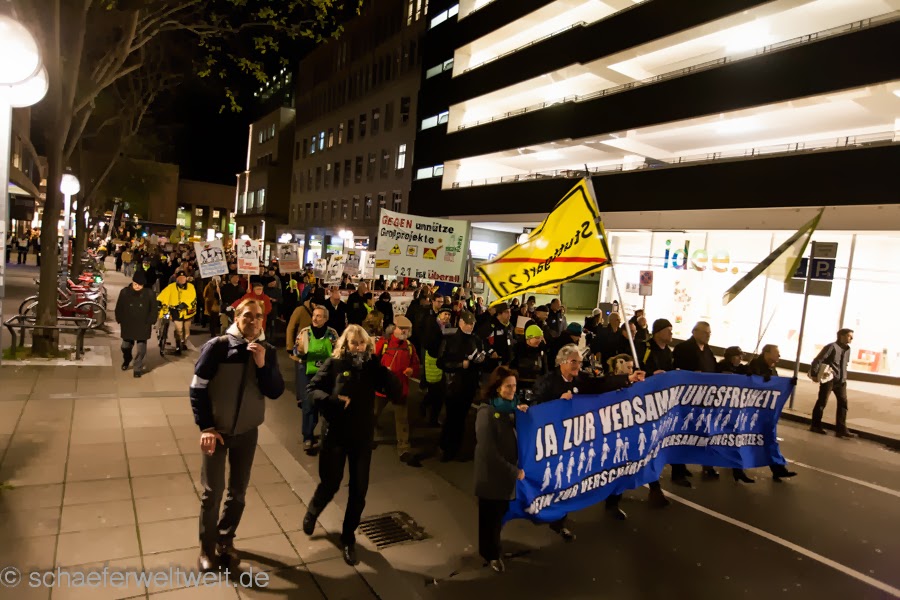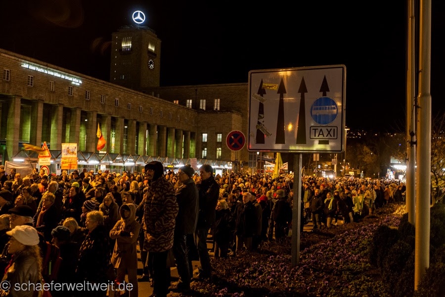 Wie man als ortskundiger unschwer erkennen kann, reicht der Platz auf der Straße vor dem Hauptbahnhof bei weitem nicht aus. Leider wird seit längerer Zeit die Straße nur noch in einer Richtung gesperrt – was die Menschen natürlich (um etwas zu hören) auf den Gehweg zwingt. Sie sind dadurch gezwungen sich vor den Läden dort aufzustellen. Diese haben sich ja nun auch, dem vernehmen nach, evtl. deshalb bei Ordnungsbürgermeister Dr. Martin Schairer beschwert. Worauf dieser aber überraschenderweise nicht die zweite Spur der Straße über den Arnulf-Klett-Platz sperren lies, sondern statt dessen einfach die Demo in die Lautenschlagerstraße verbannen wollte. Wie ortskundige wissen ist diese viel zu klein für diese Menge an Menschen (vgl . Bild oben oder auch die Bilder des Demozuges der durch die Lautenschlagerstraße läuft!!!). Leider bleibt es mir ein Rätsel warum er zu dieser Erkenntnis gelangte, aber ich würde ihn gerne zu einer Ortsbegehung begleiten, damit er sich ein Bild von dieser Straße machen kann. Am Besten bei der nächsten Montagsdemo damit er vergleichen kann…