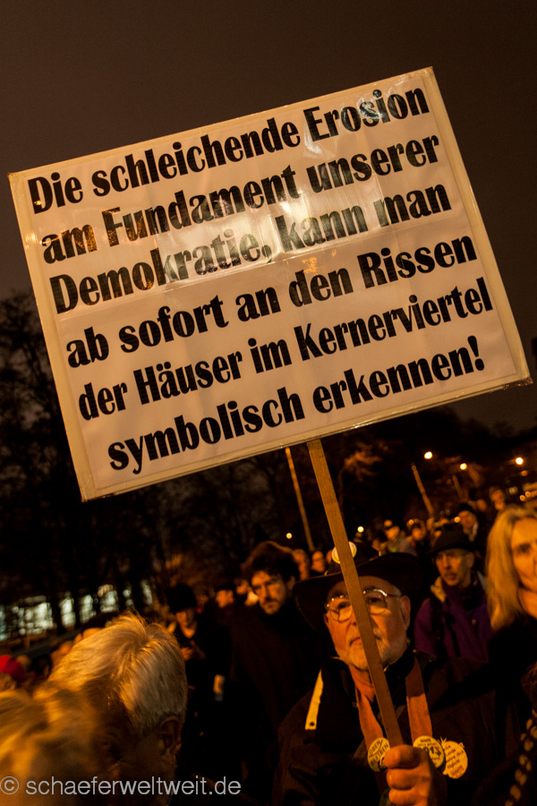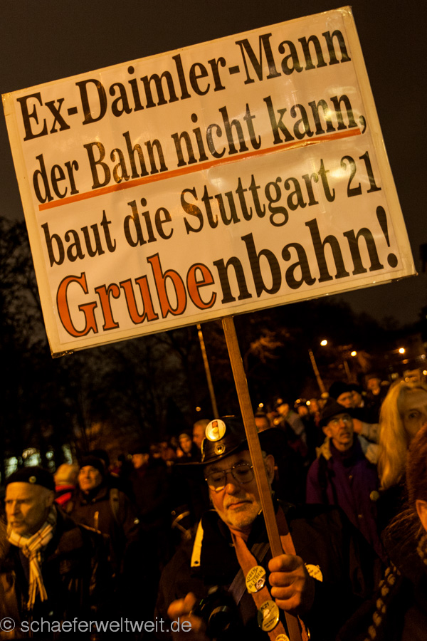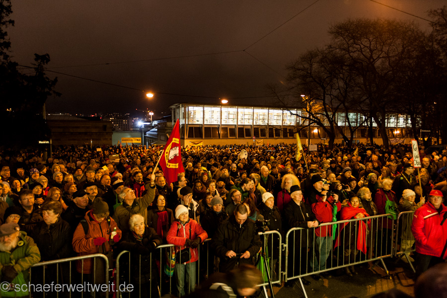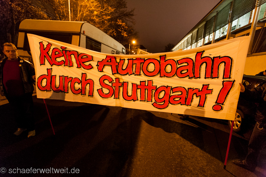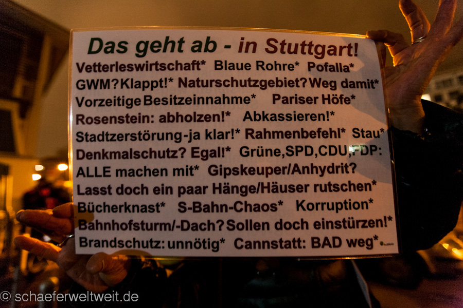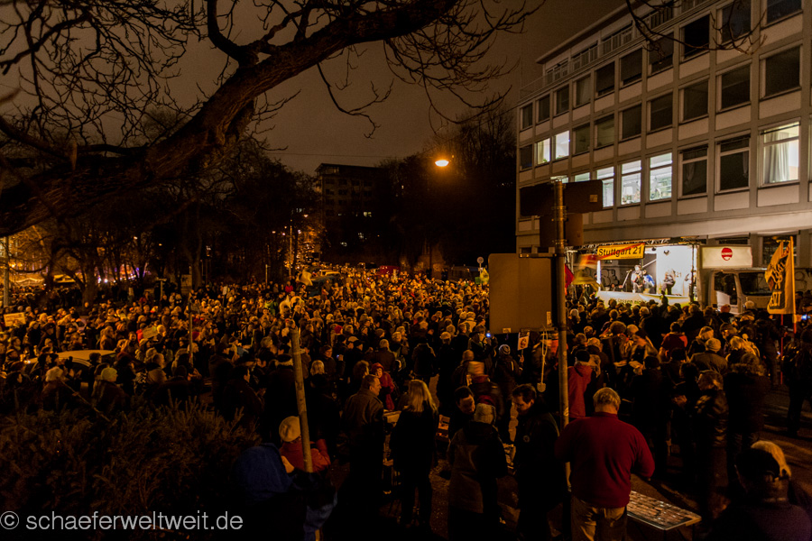 IMG_7259Am 20.01.14 fand die Montagsdemonstration gegen Stuttgart 21 mit rund 2000 Teilnehmern vor dem Stuttgarter Hauptbahnhof statt. Die Demonstration zog nach wenigen Minuten in einem kurzen Demonstrationszug ins Kernerviertel, wo eine Kundgebung vor dem beschädigten Haus der Landeswasserversorgung statt fand. Nach der Kundgebung zog die Demonstration zum Rosensteinpark, wo seit dem Mittag des 20.01.14 Rodungen für den Rosensteintunnel und das Projekt Stuttgart 21 stattfinden.