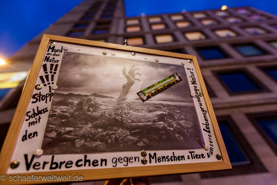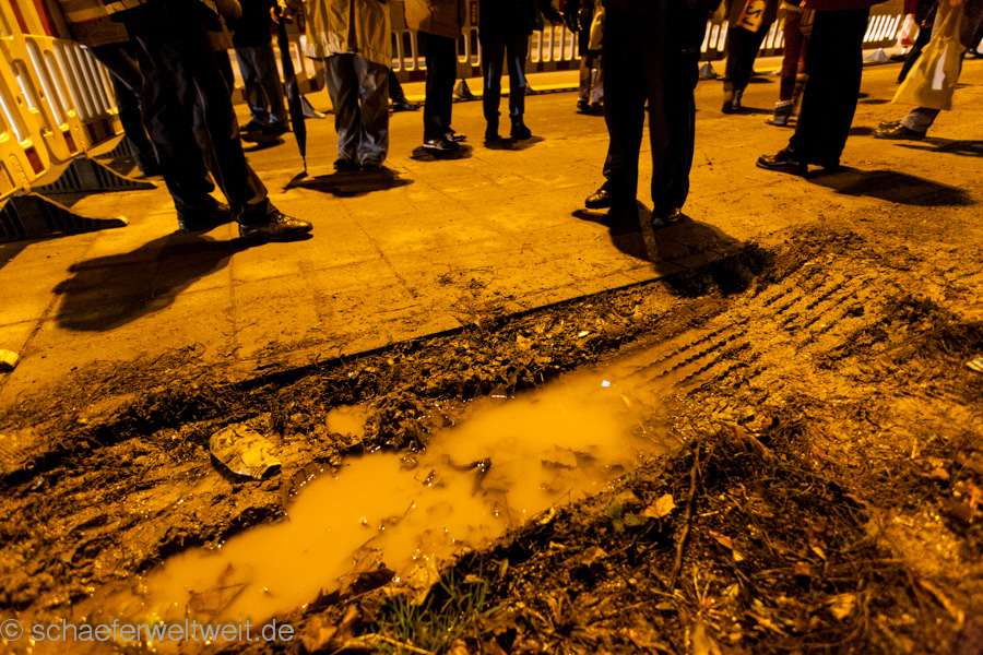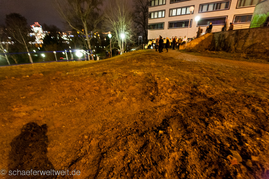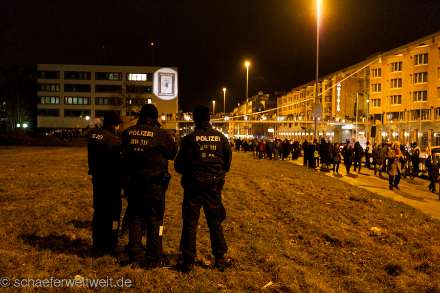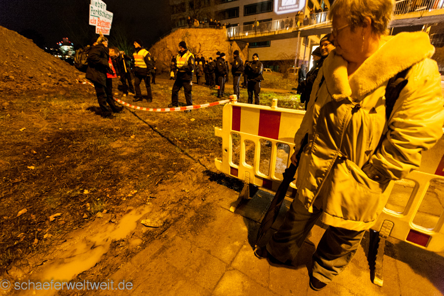 Der Weg über befestigte Wege wurde von der Polizei verweigert obwohl nur ca. 10m weiter hinter den Absperrungen ein normaler sauberer Weg verlief. Wie Herr Volker Weinstock (Polizeidirektor und Einsatzleiter an diesem Abend) erklärte, wäre die Wiese zwischen Wullesteg und Planetarium der Demo zugewiesen worden. Warum die Demonstranten aber nicht einfach die paar Meter weiter durften um ohne Dreck weiter / nach Hause zu kommen blieb nicht nachvollziehbar.