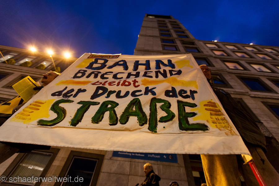 Eine PM von 20:06 Uhr vom Sprecher der APS wiederspricht aber der Aussage von Herr Weinstock und dem Anwesenden Zuständigen vom Ordnungsamt. Sie liest sich wie folgt: „Entgegen der Anmeldung durfte der Demozug nicht vor dem Innenministerium enden. Die Polizei versperrte den Zugang zum angemeldeten Ort – mit dem Ergebnis, dass die Demoteilnehmer die Versammlung nur über eine unebene, matschige und schlecht beleuchtete Baufläche mit anschließenden Treppen verlassen konnten. Einen behinderten- und altengerechten Ausgang gab es nicht, der Weg zur nahegelegenen Stadtbahnhaltestelle Neckartor wurde von der Polizei komplett versperrt. Gegen diese kurzfristige und unzumutbare Änderung wird Beschwerde eingelegt.“