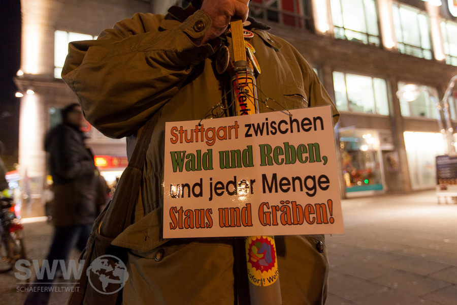 „Heute zeigen wir den verantwortlichen Politikern erneut und zum 300. Mal, dass Stuttgart 21 beendet werden muss“, sagt Matthias von Herrmann, Pressesprecher der Parkschützer während der Kundgebung. „Das Projekt krankt an allen Ecken und Enden: Der Brandschutz ist weiterhin ungelöst, die Statik des Tunnelbahnhofs ist nicht genehmigt, die Finanzierung ist ungeklärt, die geplante Schräglage der Gleise ist gesetzeswidrig. Ministerpräsident Kretschmann ist hier ebenso gefordert wie Bundeskanzlerin Merkel, die im März 2013 nur aus politischen Gründen das Aus von Stuttgart 21 verhindert hat. Jetzt ist, wie unser erster Redner Prof. Rochlitz gesagt hat, die Zeit, das Projekt politisch zu beenden, bevor die Bahn AG vollends in finanzielle Schieflage gerät – wegen Stuttgart 21.“