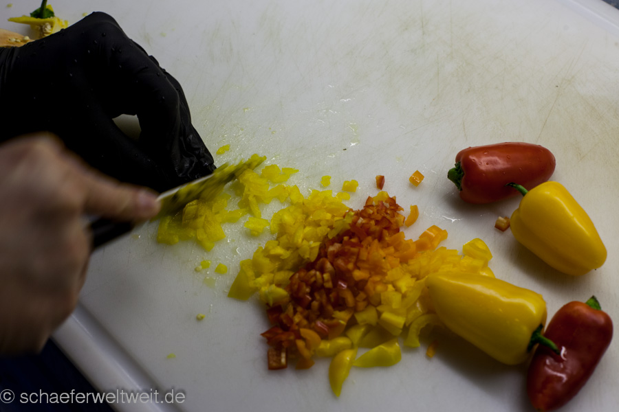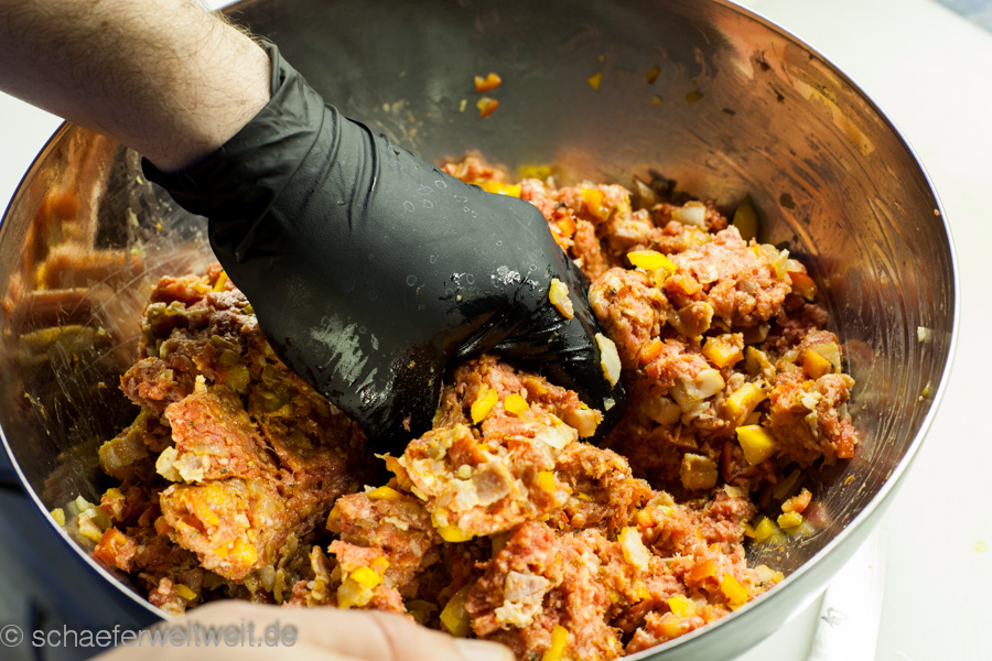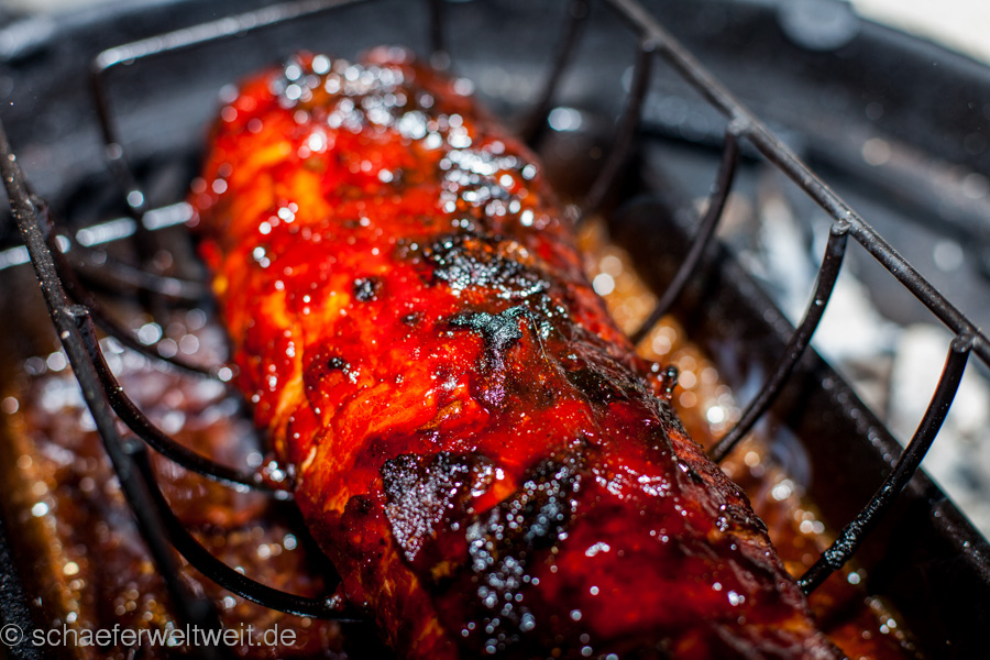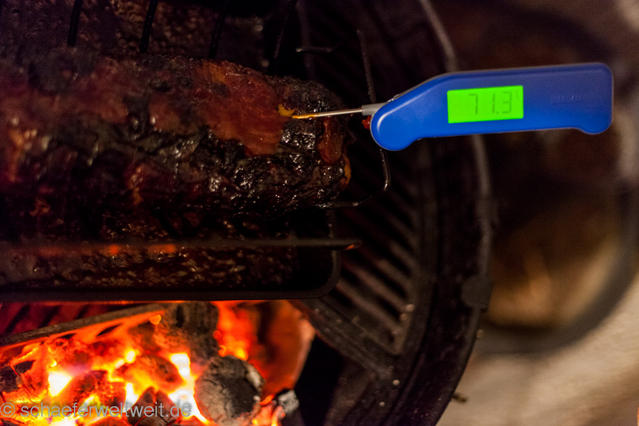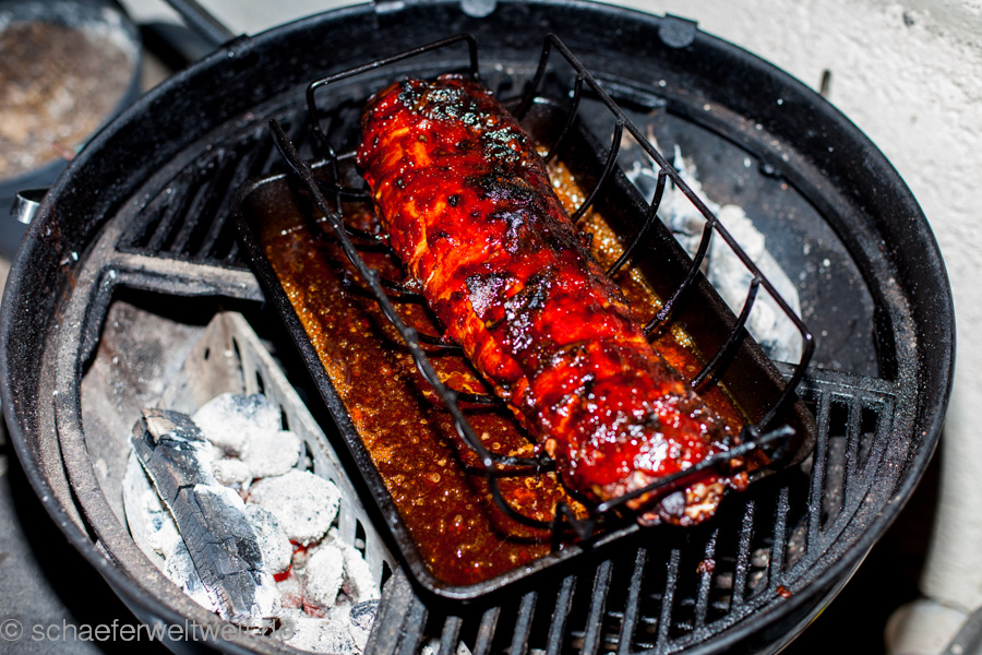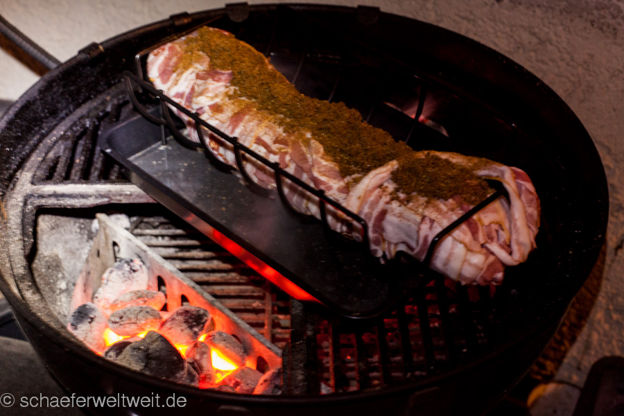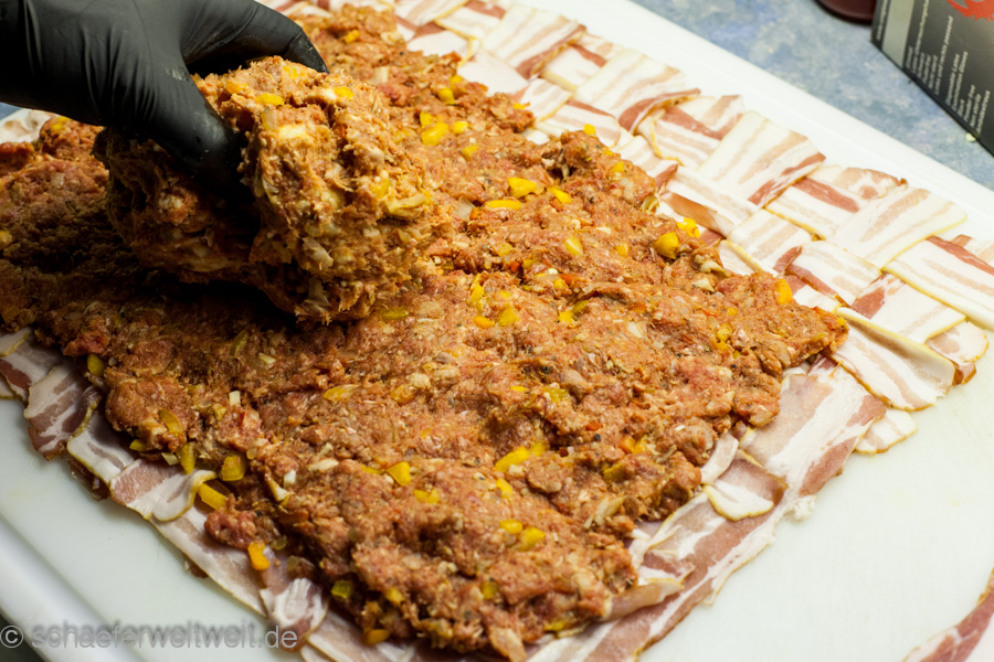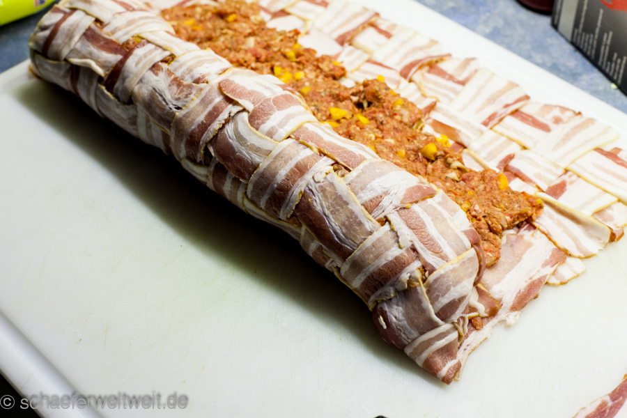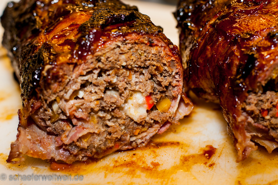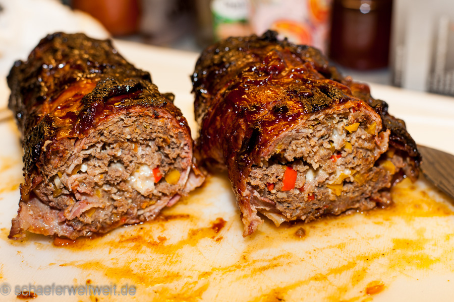 Ein Teil des Specks mit den fein gewürfelten Zwiebeln anbraten und danach mit der geschnittenen Paprika und dem gewürfelten Knoblauch zusammen vermengen. IMG_9161Mit Salz, Pfeffer und scharfem Paprikapulver abschmecken. Dann eine gute Hand voll der Masse mit dem Gorgonzola verkneten. Die Hackmasse zuerst auf dem Bacon Netz verteilen – danach die Hackfleisch-Käsemasse in die Mitte legen und das ganze zu einem Braten rollen. Der Braten wird dann mittig Indirekt in den vorgeheizten Kugelgrill (ca. 180 Grad) gelegt. IMG_9199Über dem Braten großzügig Brown Sugar aufhäufen, dieser schmilzt dann über den Braten und karamelisiert mit dem Bacon. Nach ca. einer Stunde wird erneut etwas Zucker darauf verteilt und eine erste Lage BBQ-Sauce über den Braten gepinzelt. Die Garraumtemperatur in dieser Zeit bis auf ca. 120 Grad abfallen lassen. Die Temperatur senkt man bei einem Kugelgrill indem man die Lüftungsregler Unten und Oben fast komplett schließt. Meist reicht (bei einer Konstruktion wie beim Weber 57er) ein ca. Bleifstift breiter Spalt für 120 Grad aus. (Das hängt aber auch und nicht zuletzt von Art und Qualität der Kohlen ab. Etwa alle 10 Minuten BBQ-Sauce nachlegen und weiter wiederholen – bei einer Kerntemperatur von +70 Grad ist das Hack gar (nach ca. 2 Stunden) und der Braten fertig.