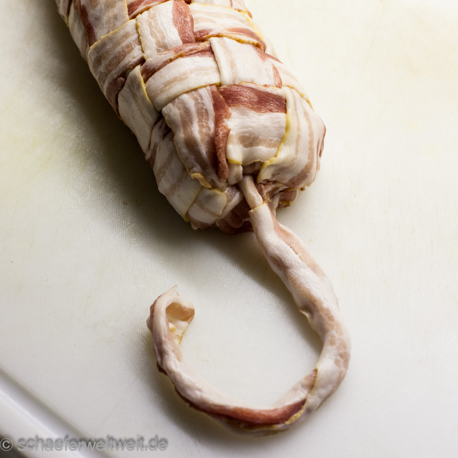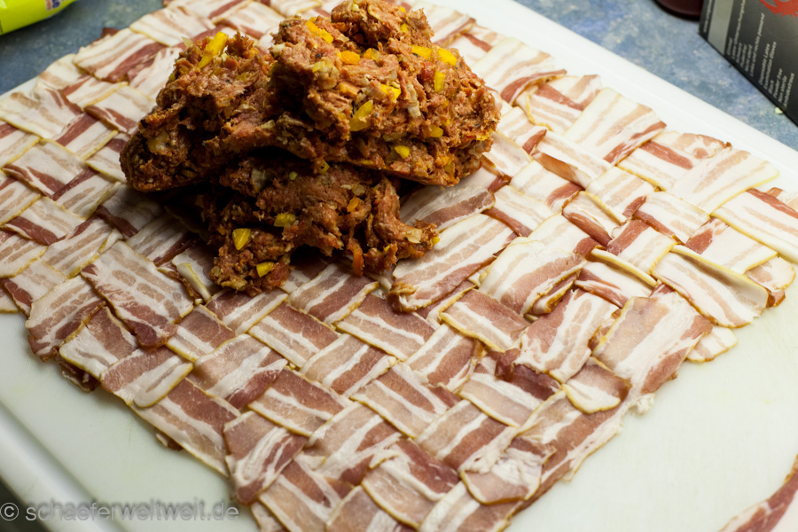 IMG_9194Was gibt es passenderes als am 4. Advent ein bisschen zu Grillen? Diesmal ein weiteres BBQ-Standard Gericht: „Bacon Bomb“ (Speckumwickelter Hackbraten) mit Gorgonzola und Brown-Sugar BBQ-Saucenkruste aus dem Kugelgrill. Benötigt wird dafür 1kg Hackfleisch, 200g (reifer) Gorgonzola, Zwiebeln, Knoblauch, Paprika und noch etwas Bacon … genau 1kg! Aus dem Bacon wird ein Bacon-Netz geflochten (siehe zb. auch Armadillo Eggs oder Gorgonpenjo)