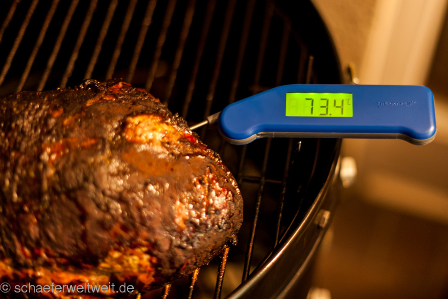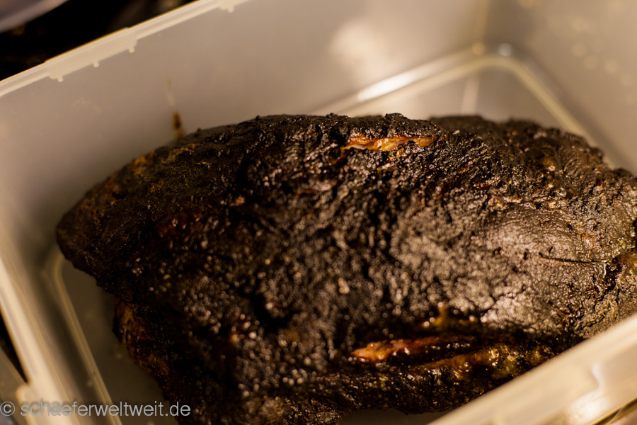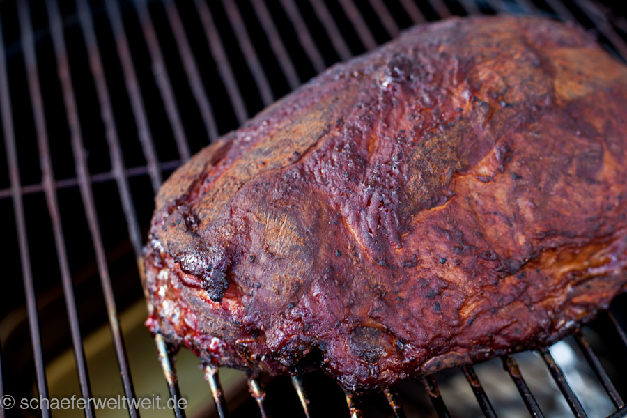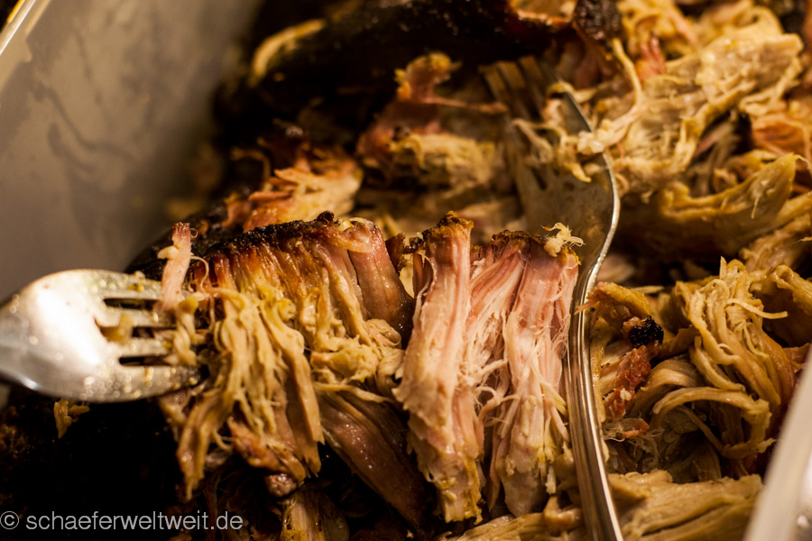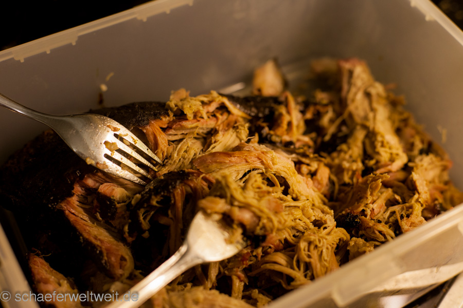 Ein einfaches weit verbreitetes BBQ-Rezept, dessen einziges Geheimnis „die Zeit“ ist. Pulled Pork wird es genannt – was soviel heist wie „(auseinander) gezogenes Schwein“. Ein Stück Schweinenacken (hier 2,5kg) wird mit Gewürzen (Zwiebelpulver, Pfeffer, Paprika, geräucherte Paprika, dark brown Sugar) eingerieben und dann bei ca. 120 Grad bis zur Kerntemperatur von ca. 90 Grad in einen geschlossenen Grill gelegt. In diesem Fall dauerte das 9 Stunden (immer unterschiedlich je nach Fleisch). ca. 3 Stunden wurde mit Kirschholz geräuchert. Das Fleisch sieht dann aus wie ein großes Stück Kohle, ist aber so weich dass es fast von selbst zerfällt. Es wird dann zerrupft und mit BBQ Sauce und meist auch Coleslaw (Krautsalat) gegessen.