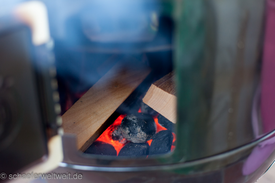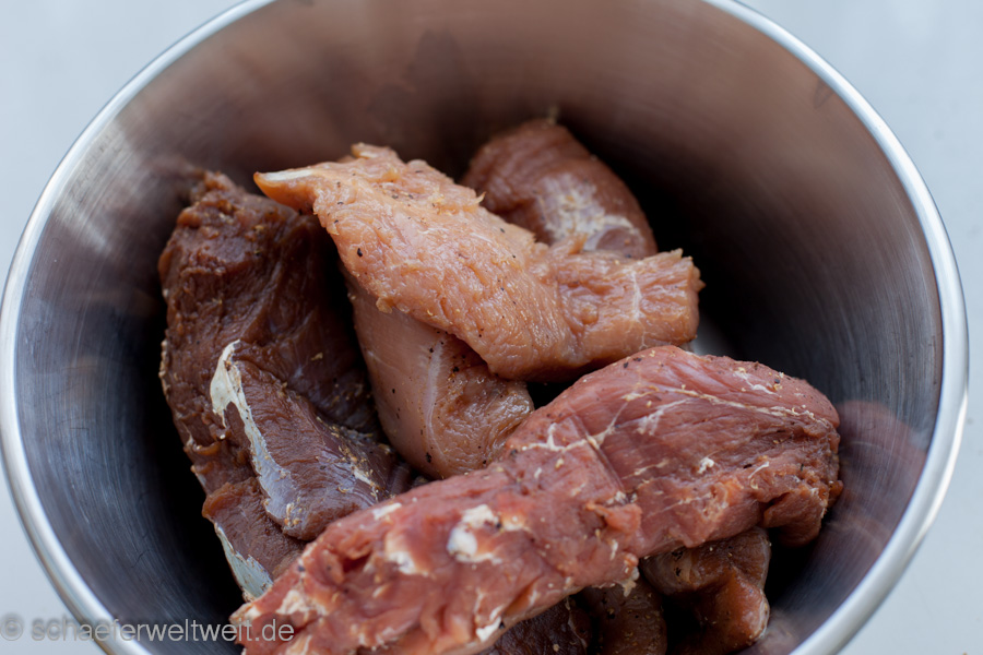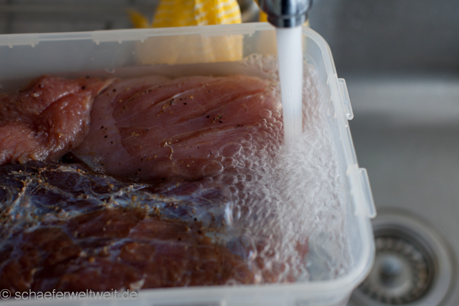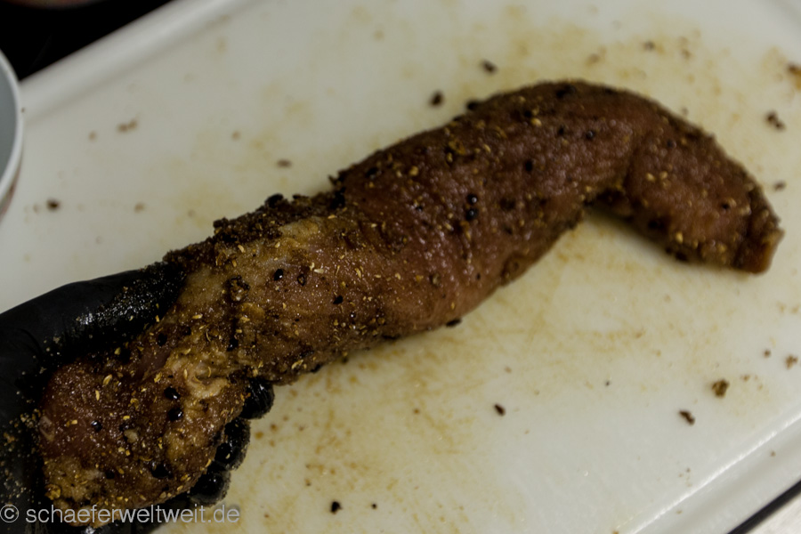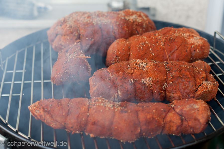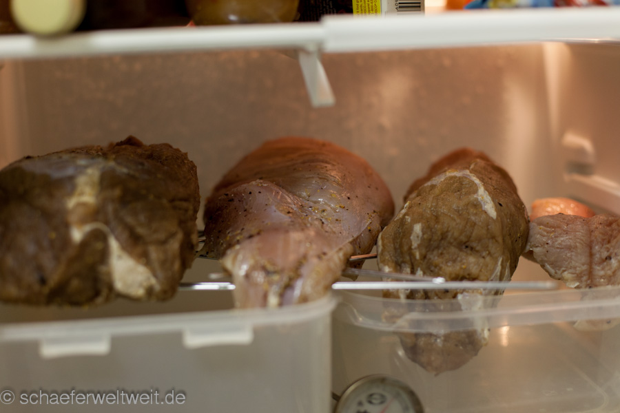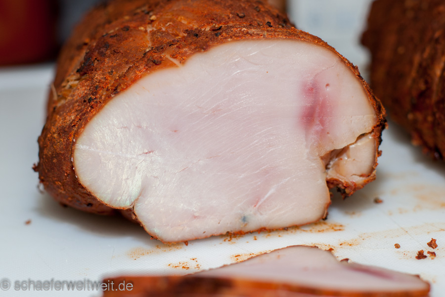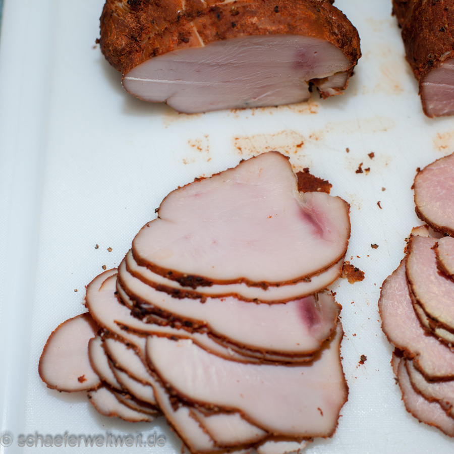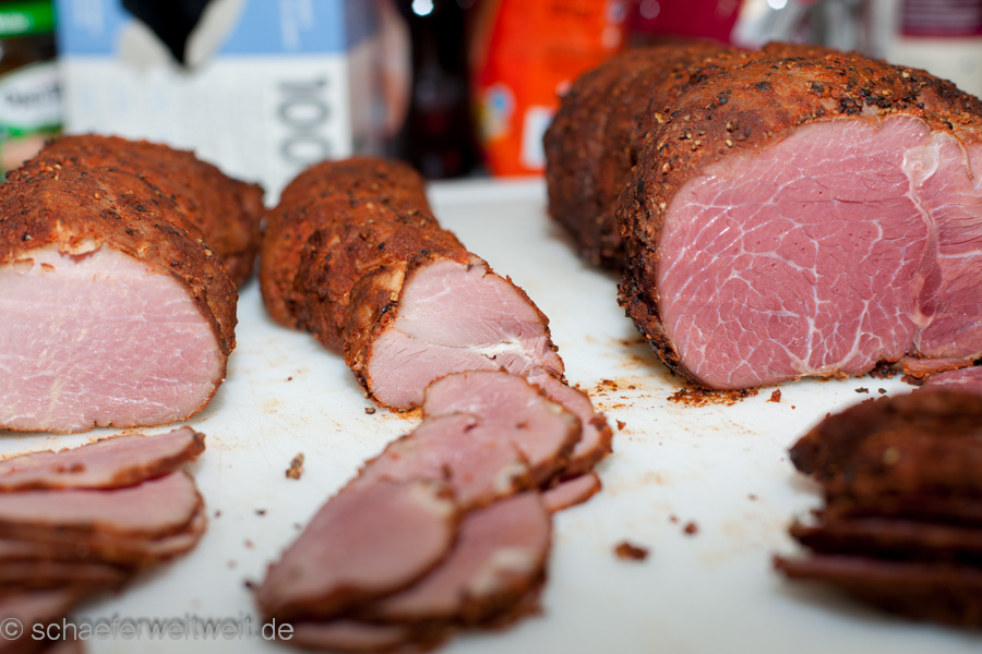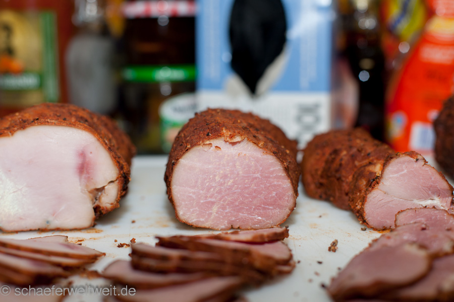 Hier in diesem Beispiel wurden verschiedene Fleischarten verarbeitet, nicht gekocht aber 3 Wochen gepökelt. Dabei war Putenbrust (KT70), Rinderhüfte oder Semerolle (KT62) und Schweinefilet (KT62). Gepökelt wurden die Stücke 21 Tage mit Koriander, Pfeffer, dark brown Sugar (nicht vergleichbar mit „braunem Rohrzucker“!) und Pökelsalz. Nach dem pökeln lässt man das Fleisch zum „durchbrennen“ einen Tag luftig ruhen. Danach wird es mit Pfeffer und geräucherter Paprika evtl. Zwiebelpuver, auch mal Ingwer oder Muskat gewürzt und zur genannten Kerntemperatur (siehe oben) geräuchert. Danach folgt eine weitere Ruhephase von ca. einem Tag (nach dem Abkühlen) im Kühlschrank – fertig.