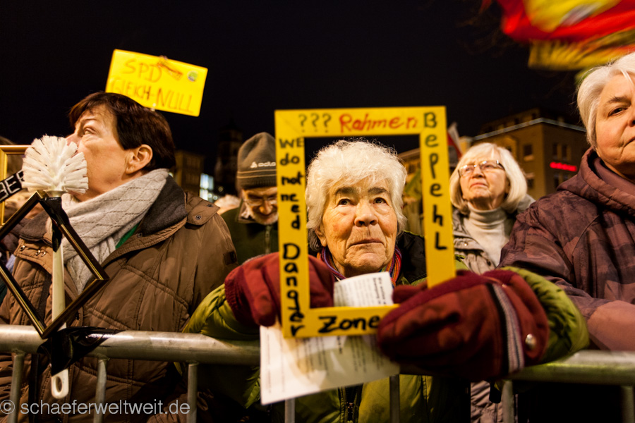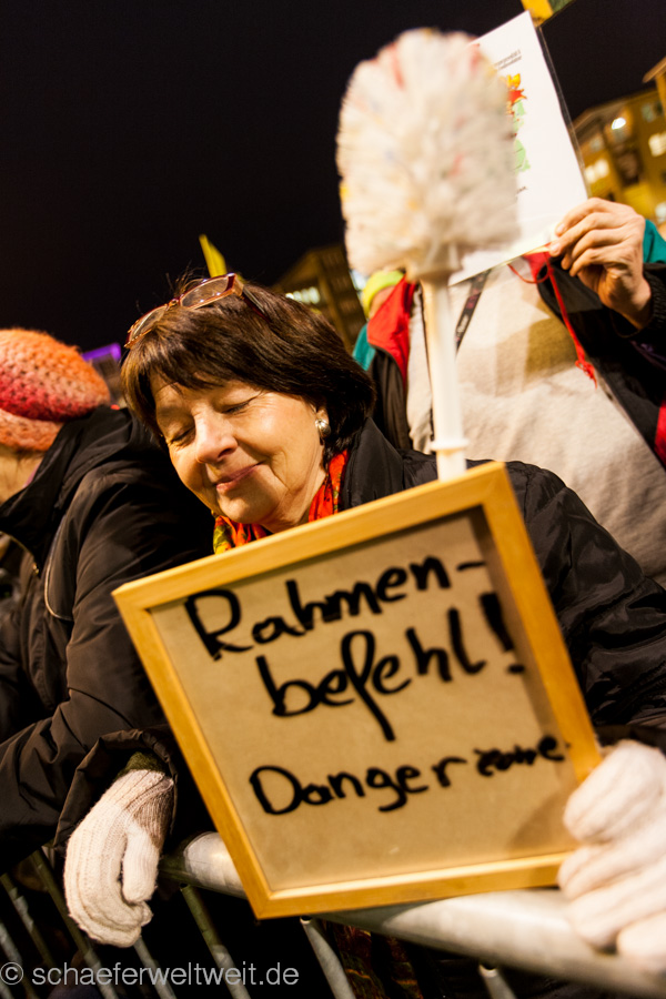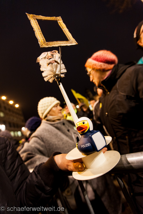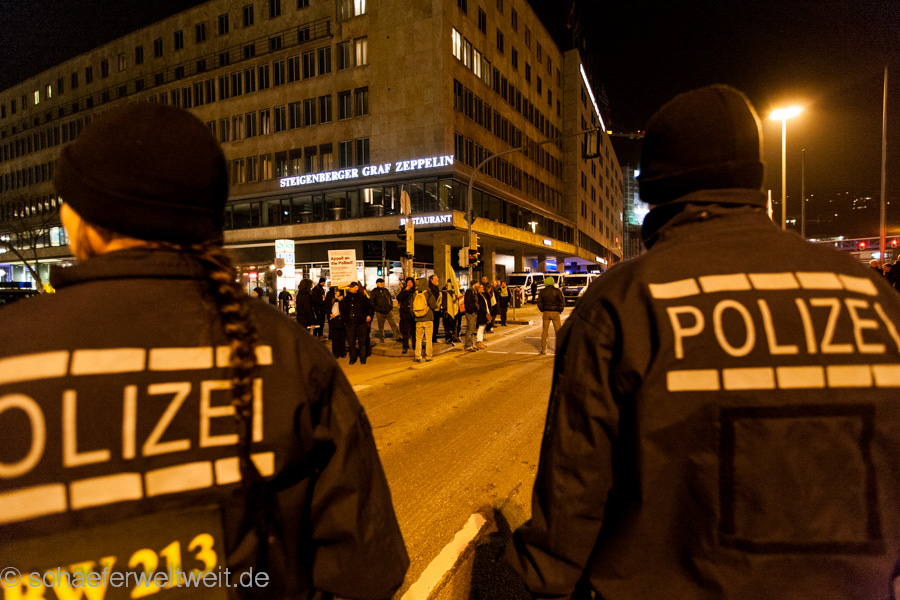 In der Lautenschlagerstraße angekommen endete die Demonstration und das Frontbanner verschwand recht schnell, Ordner waren keine zu sehen. Schon an der Ecke Kronenstraße/Friedrichstraße war ziemlich auffällig wie wenige Polizisten hier die Demo „umleiteten“ – von Ordnern der Demo war auch dort keine Spur. Auch an der Ecke Lautenschlagerstraße/Schillerstraße war dies wieder zu bemerken. Zuerst sperrten einige wenige Polizisten mehr oder weniger motiviert die Straße ab. Sie ließen aber die Menschen über die Fußgängerampel zum HBF passieren was schon absehbar Probleme ergeben wird. Dann setzte zudem der bisher immer vor dem Demozug fahrende Polizeitransporter seine Fahrt in die Schillerstraße fort. Die Teilnehmer der in der Lautenschlagerstraße endenden Demo folgten natürlich wie bisher seit dem Rathaus auch diesem Fahrzeug. Schon war die Schillerstraße wie zufällig wieder voller Menschen. Die Polizei zog sich dann auffällig zügig und ob de Menschenmassen hilflos zurück und filmte diese Auffällig inszeniert wirkenden Szenen. Nach einigen Aufforderungen die Straße zu verlassen taten dies die Menschen auch von alleine. Die Polizei hatte wohl auch alle Videos und Aufnahmen die sie brauchte oder wollte.