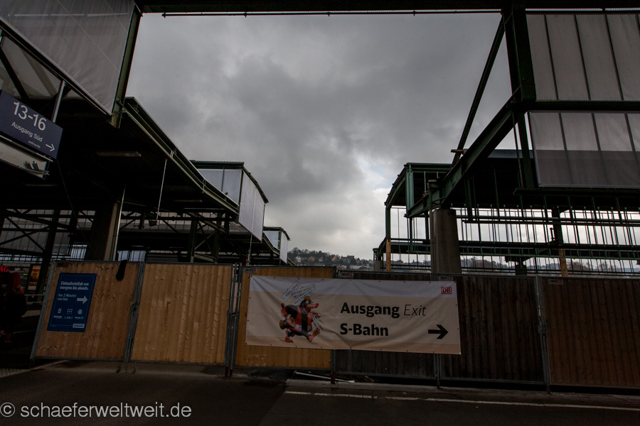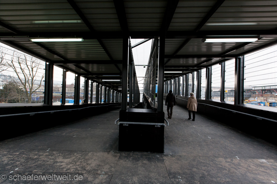 Also es tut mir leid aber ich bin ein visueller Mensch – ich verbinde alles automatisch mit Eindrücken die ich habe – so geht es mir auch bei der „Neuen Rampe zum provisorischen Querbahnsteig“ am Bahnhof in Stuttgart. Diese Erinnert mich an einen Schlachthof – an die Rampe auf denen die Tiere vom LKW in den Schlachthof geführt werden. Hier einige Eindrücke der Rampe und der neuen Blickwinkel die sich durch sie ergeben.