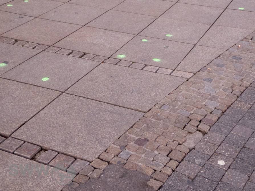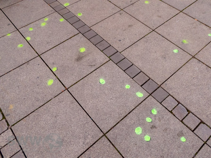 Schüler des St.-Agnes-Gymnasiums und der Waldorfschule Kräherwald haben alle festgetretenen Kaugummi mit grüner Kreidefarbe markiert.
