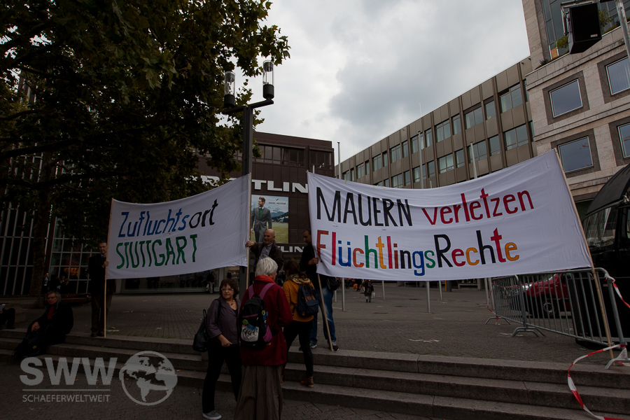 Eine Welt, freie Menschen, Flüchtlinge sind willkommen, hieß es am Samstag auf dem Stuttgarter Marktplatz. Bei der Kundgebung auf dem Stuttgarter Marktplatz zeigten viele Bürger Stuttgarts ihre Solidarität mit den Flüchtlingen dieser Welt.