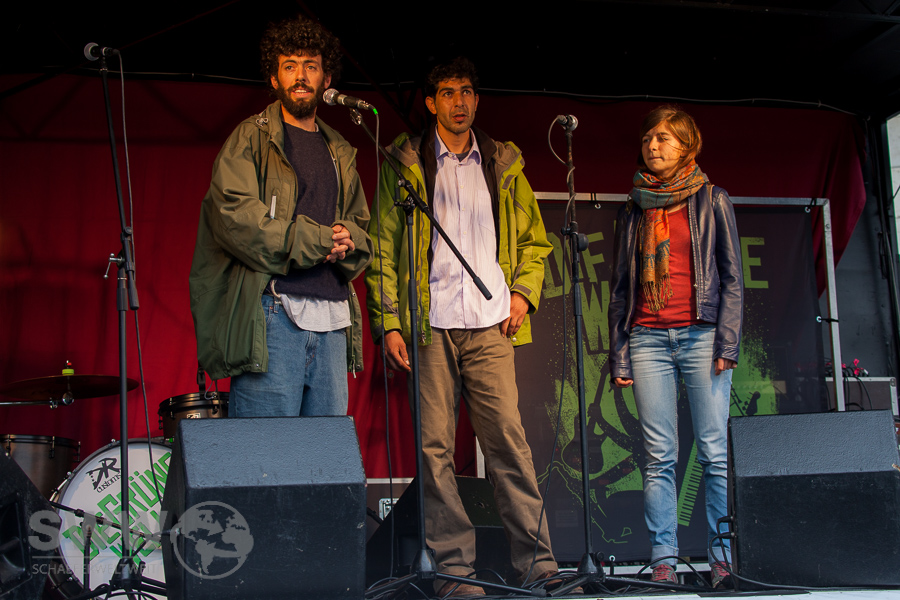 Neben den Bands „Die Grüne Welle“ und „Antiheld“ sprachen auf der Kundgebung die DIDF Stuttgart über die Verfolgung von Kurdinnen und Kurden, Augenzeugen berichteten von der Ungarischen Grenze, es gab einen Bericht über Vernetzung der Flüchtlinge und die Situation in den Heimen und Klaus Stramm berichtete seinen Erlebnissen mit der „SeaWatch„.