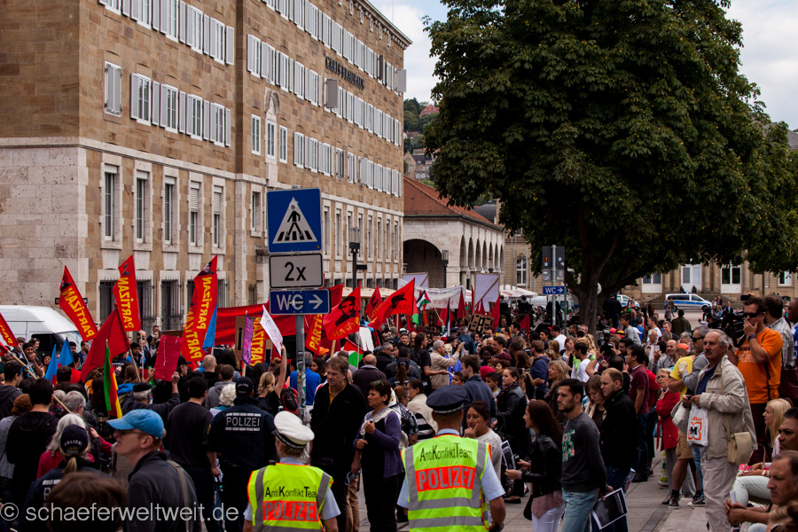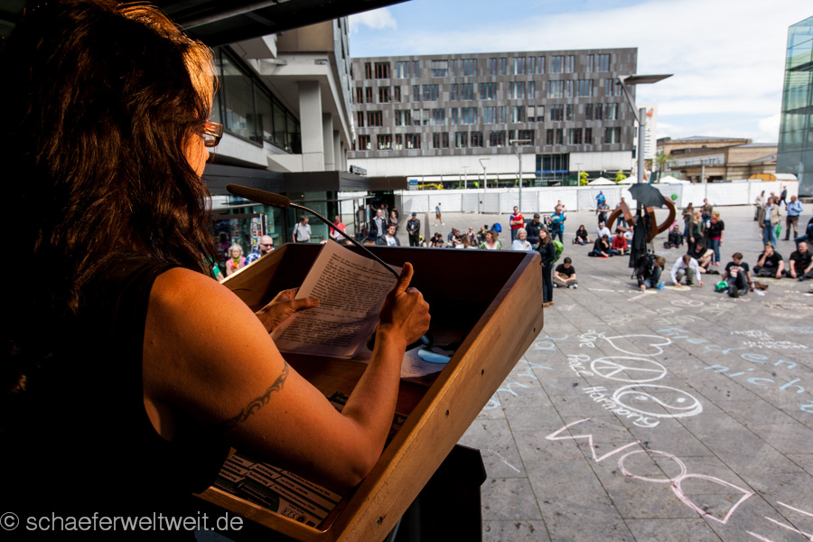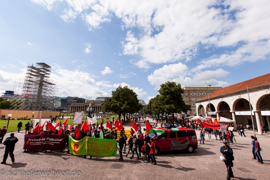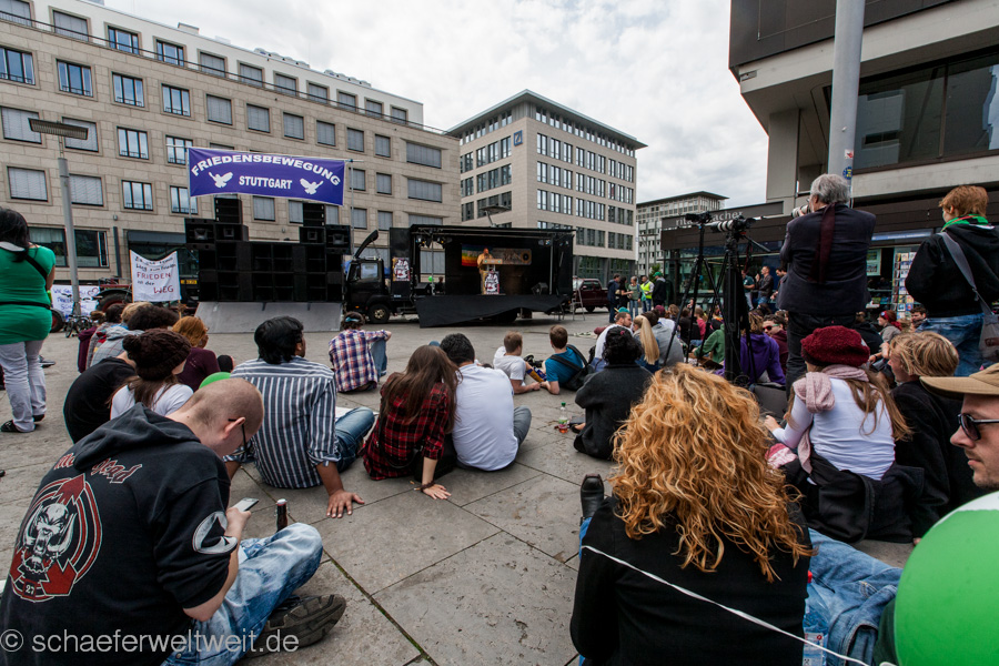 Unter dem Motto: „100 Jahre Erster Weltkrieg, 75 Jahre Zweiter Weltkrieg, 15 Jahre Kriegseinsätze der Bundeswehr: Sagt Nein zu Krieg!“ startete der sog. Ostermarsch am „AFRICOM“ in Möhringen und führte über eine Zwischenkundgebung in der Lautenschlagerstraße zum Stuttgarter Schlossplatz.