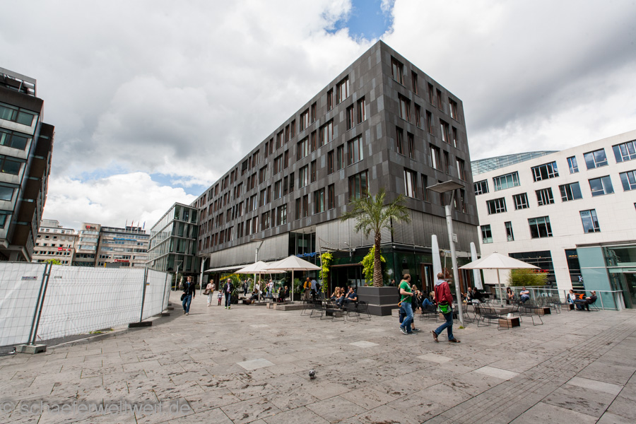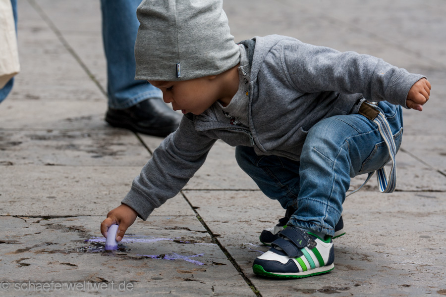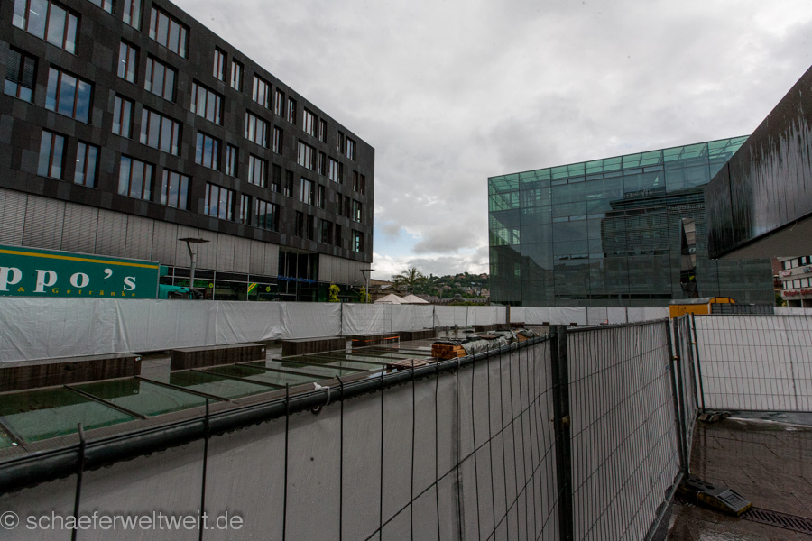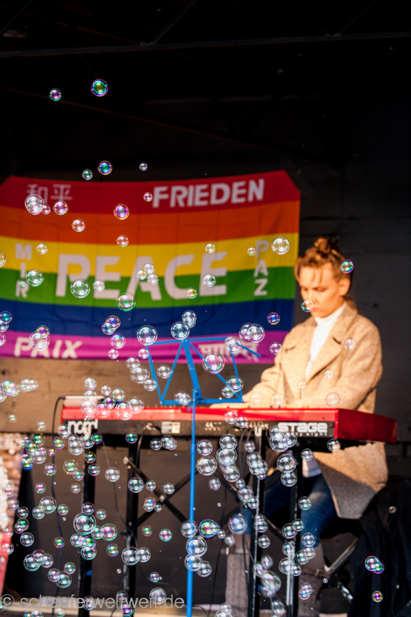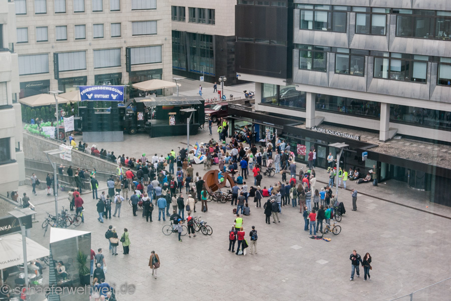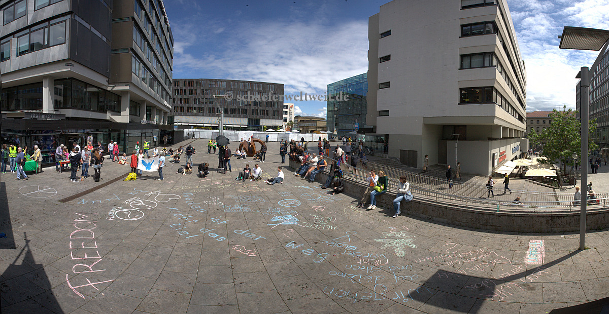 Auffällig fand ich im Vergleich zu den ersten beiden Demos dieser Gruppe, dass mittlerweile ein „Staub- und Sichtschutz“ am Bauzaun der Baustelle über den kleinen Schloßplatz entstanden ist. Davor war hier nur ein normaler „durchschaubarer“ Zaun, welcher es den Gästen der Cafes und Bars erlaubte diese Demo zu sehen. Mittlerweile sieht man die Demo nur noch wenn man sie auf dem Platz sucht…