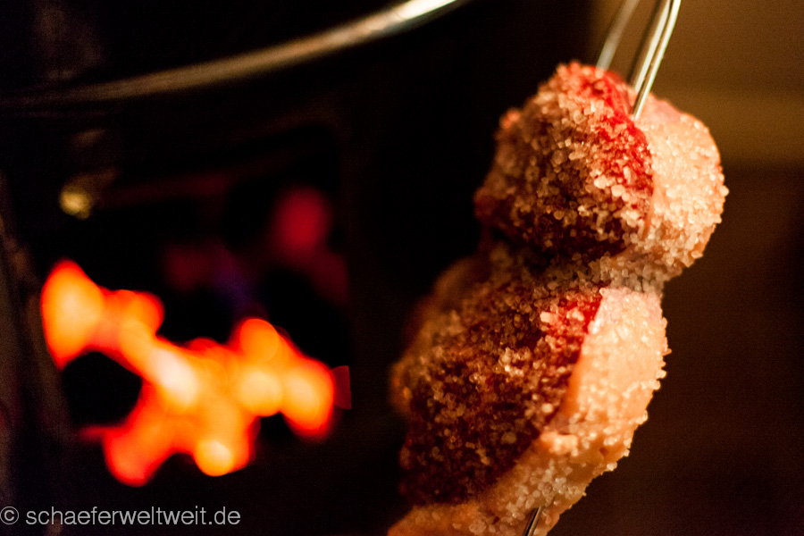 Ein einfaches weit verbreitetes BBQ-Rezept, dessen einziges Geheimnis „die Zeit“ ist. Pulled Pork wird es genannt – was soviel heist wie „(auseinander) gezogenes Schwein“. Ein Stück Schweinenacken (hier 2,5kg) wird mit Gewürzen (Zwiebelpulver, Pfeffer, Paprika, geräucherte Paprika, dark brown Sugar) eingerieben und dann bei ca. 120 Grad bis zur Kerntemperatur von ca. 90 Grad in einen geschlossenen Grill gelegt. In diesem Fall dauerte das 9 Stunden (immer unterschiedlich je nach Fleisch). ca. 3 Stunden wurde mit Kirschholz geräuchert. Das Fleisch sieht dann aus wie ein großes Stück Kohle, ist aber so weich dass es fast von selbst zerfällt. Es wird dann zerrupft und mit BBQ Sauce und meist auch Coleslaw (Krautsalat) gegessen. – mehr Bilder –