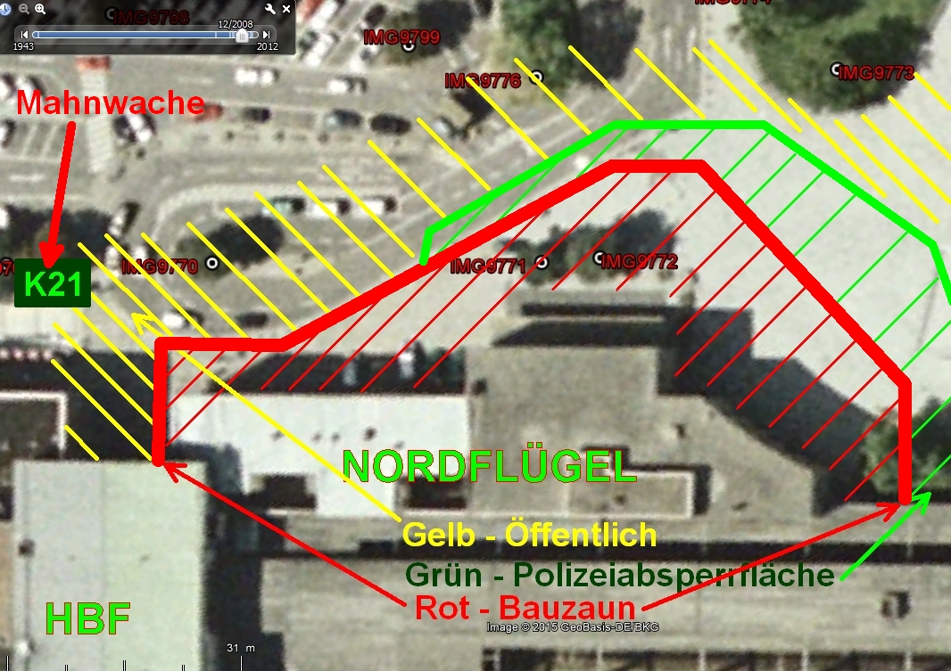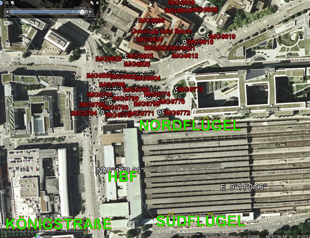 Wo war dieser Bauzaun? Wer heute an die Nordseite der Reste des Stuttgarter Hauptbahnhofes kommt wird sich schwer vorstellen können was dort in den vergangenen Jahren Zerstört wurde. Die folgenden Bilder zeigen Karten von damals – ich habe versucht die Lage des Zaunes aus dem Gedächtnis zu markieren.