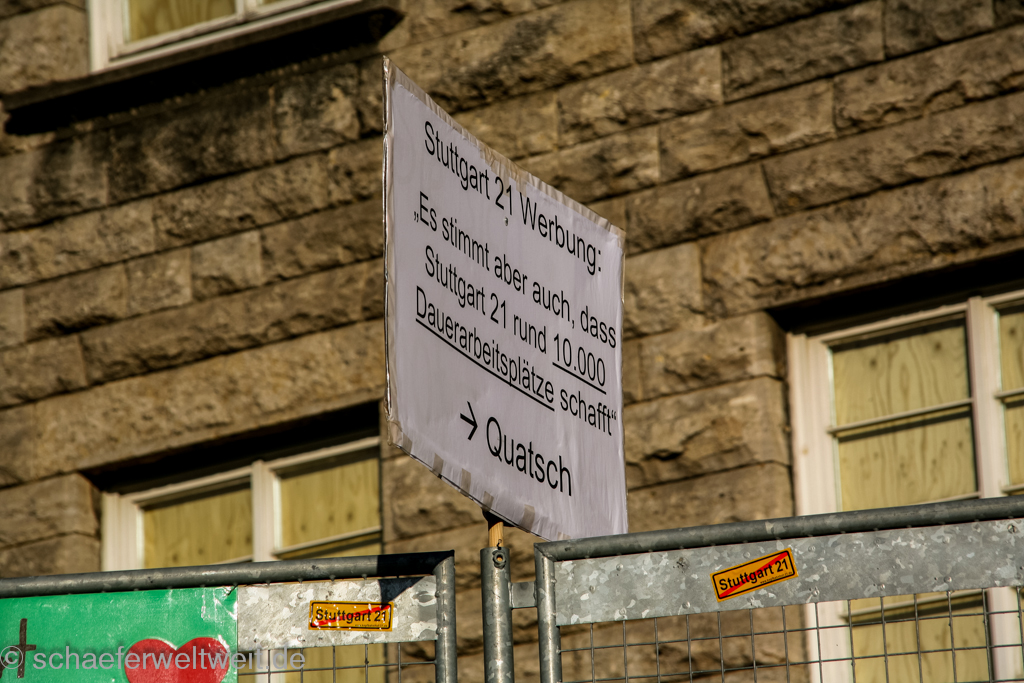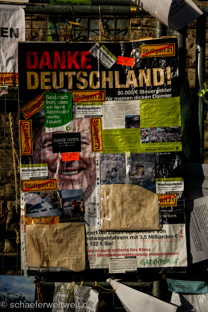 Am 30. Juli 2010 wurde am Posttrakt des Stuttgarter Kopfbahnhofes unter Polizeischutz ein Bauzaun aufgestellt. Mit diesem Zaun sollte der Abriss des sog. „Nordflügel“ des Hauptbahnhofes beginnen. Bereits nach wenigen Wochen war er mit Plakaten, Texten, Collagen, Karikaturen und allerlei Objekten beklebt und behängt. An diesem ca. 3m hohen Bauzaun nutzte die Bevölkerung zum ersten mal ebenso Einzeln und Individuell wie auch Spontan die Möglichkeit der Meinungsäußerung. Es entstanden empörte, ironische, polemische und kreative Wege mit denen viele einzelne Stuttgart 21 Gegner sich frei äußerten. Der Bauzaun gilt wohl daher auch als „soziale Skulptur im Sinne von Joseph Beuys“. Schon nach kurzer Zeit wurden sogar Führungen von Kunsthistorikern und Städtereisenden zum Zaun angeboten.