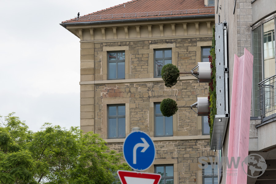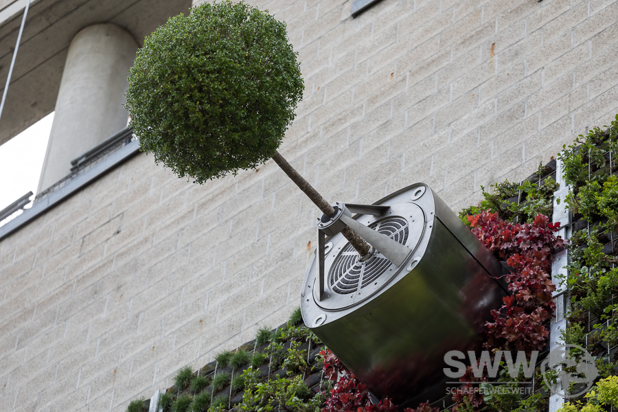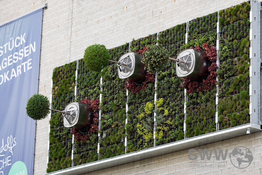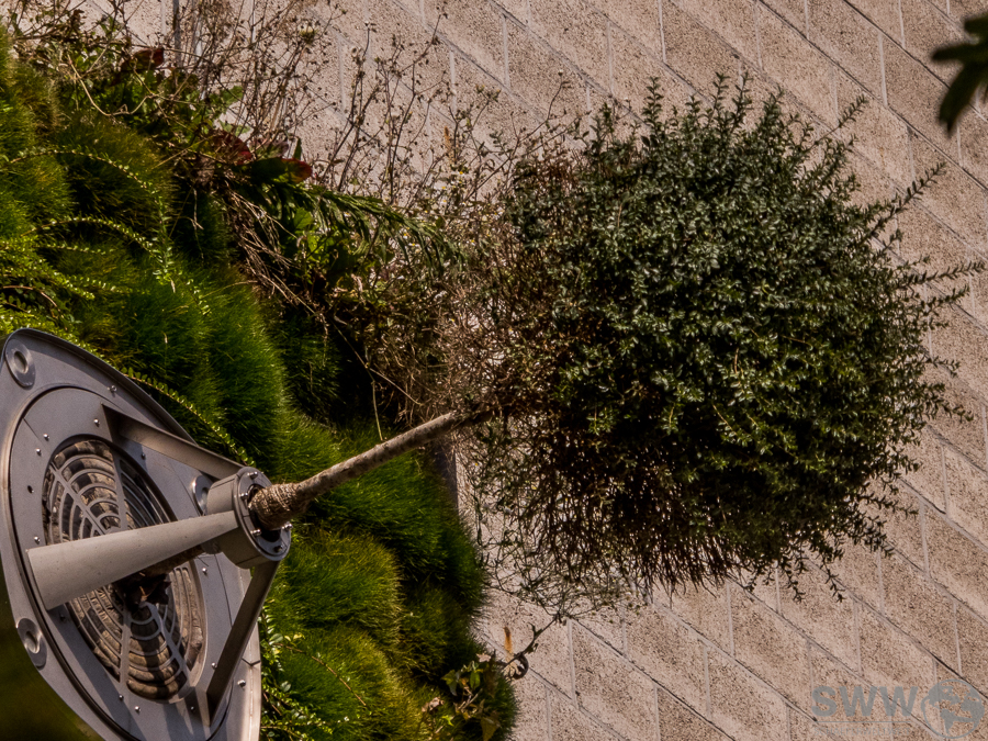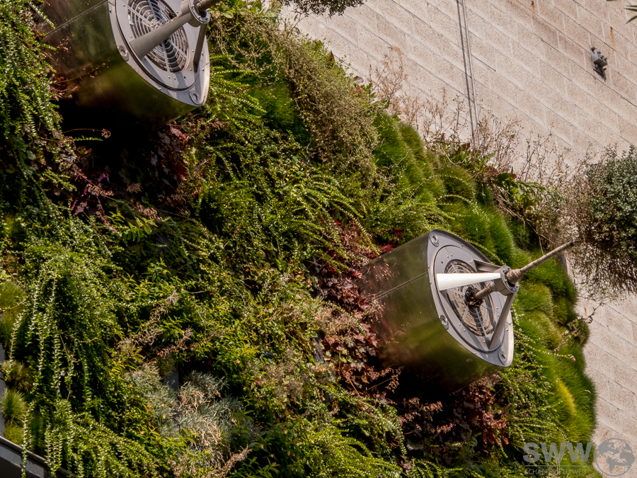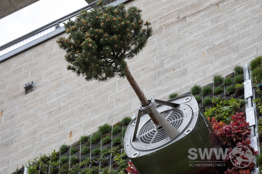 Hurra, es ist geschafft: in den vergangenen drei Tagen wurde an der Fassade des VHS-Gebäudes ein ca. 4 x 10 Meter großes Kleinpflanzenbeet mit drei schmächtigen, waagrecht eingelassenen Bäumchen, die sich langsam drehen und künstlich bewässert werden, installiert. Angeblich sollen sie für Kühlung und Luftreinigung sorgen.