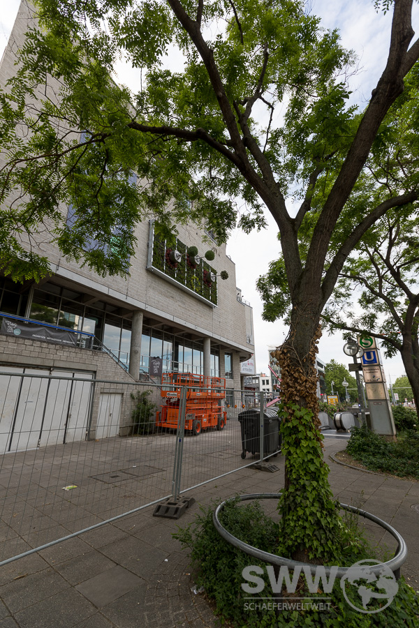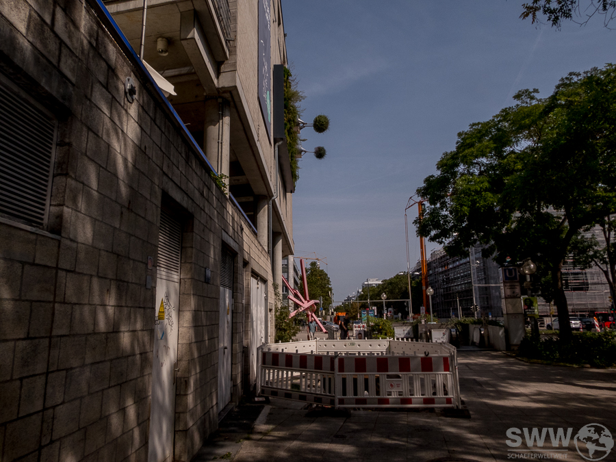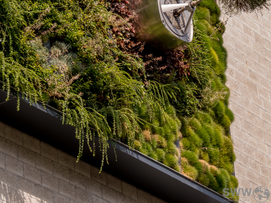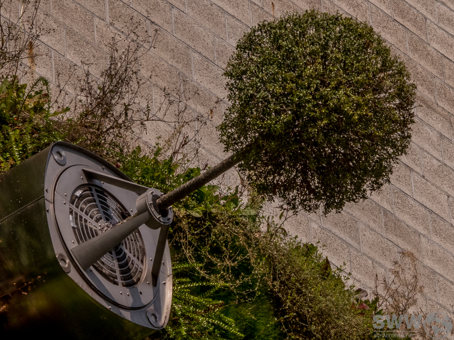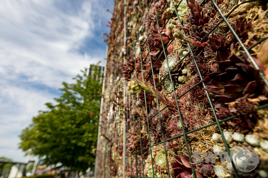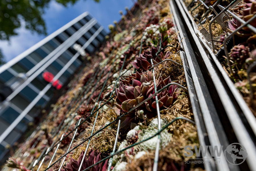 Hurra, es ist geschafft: in den vergangenen drei Tagen wurde an der Fassade des VHS-Gebäudes ein ca. 4 x 10 Meter großes Kleinpflanzenbeet mit drei schmächtigen, waagrecht eingelassenen Bäumchen, die sich langsam drehen und künstlich bewässert werden, installiert. Angeblich sollen sie für Kühlung und Luftreinigung sorgen.