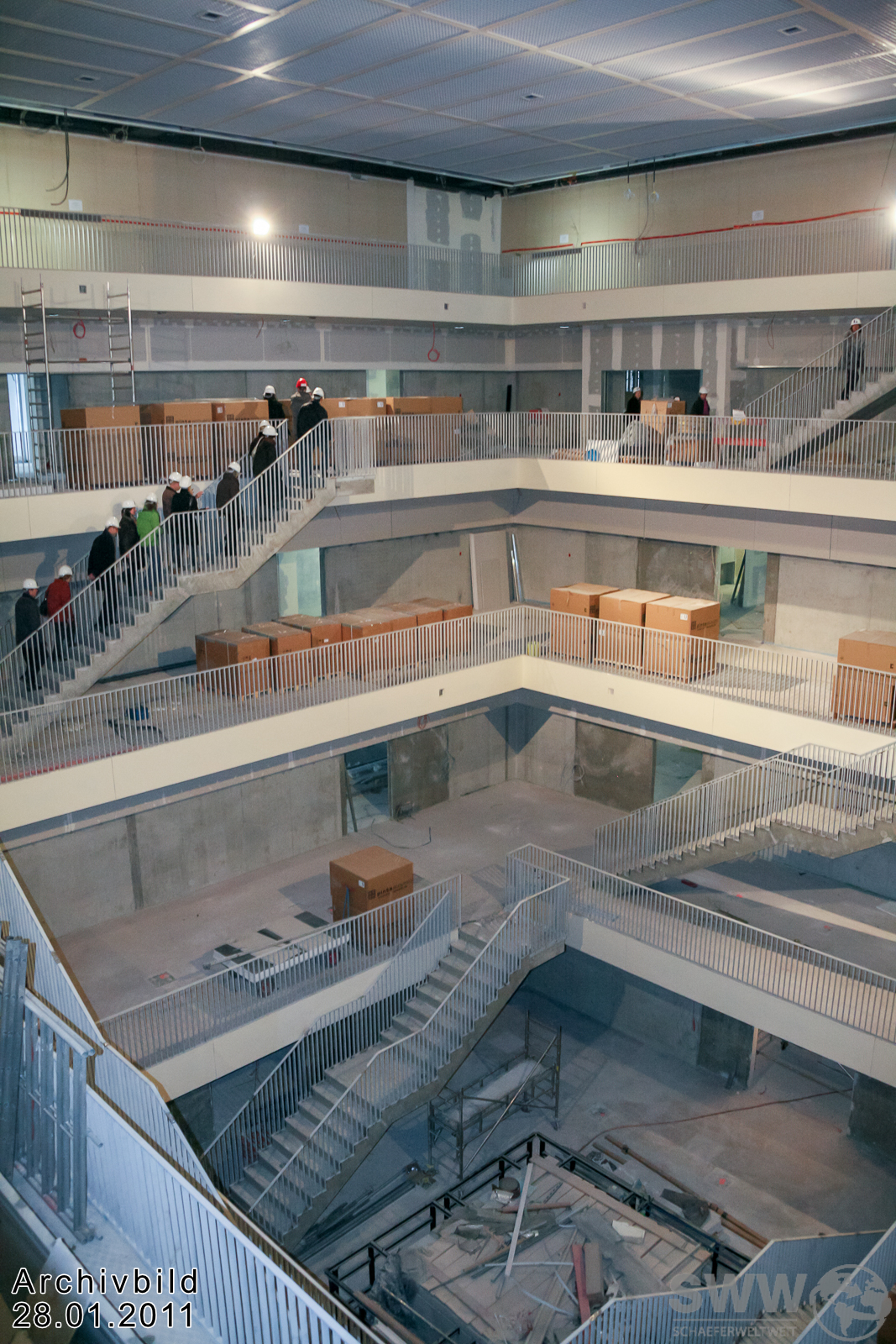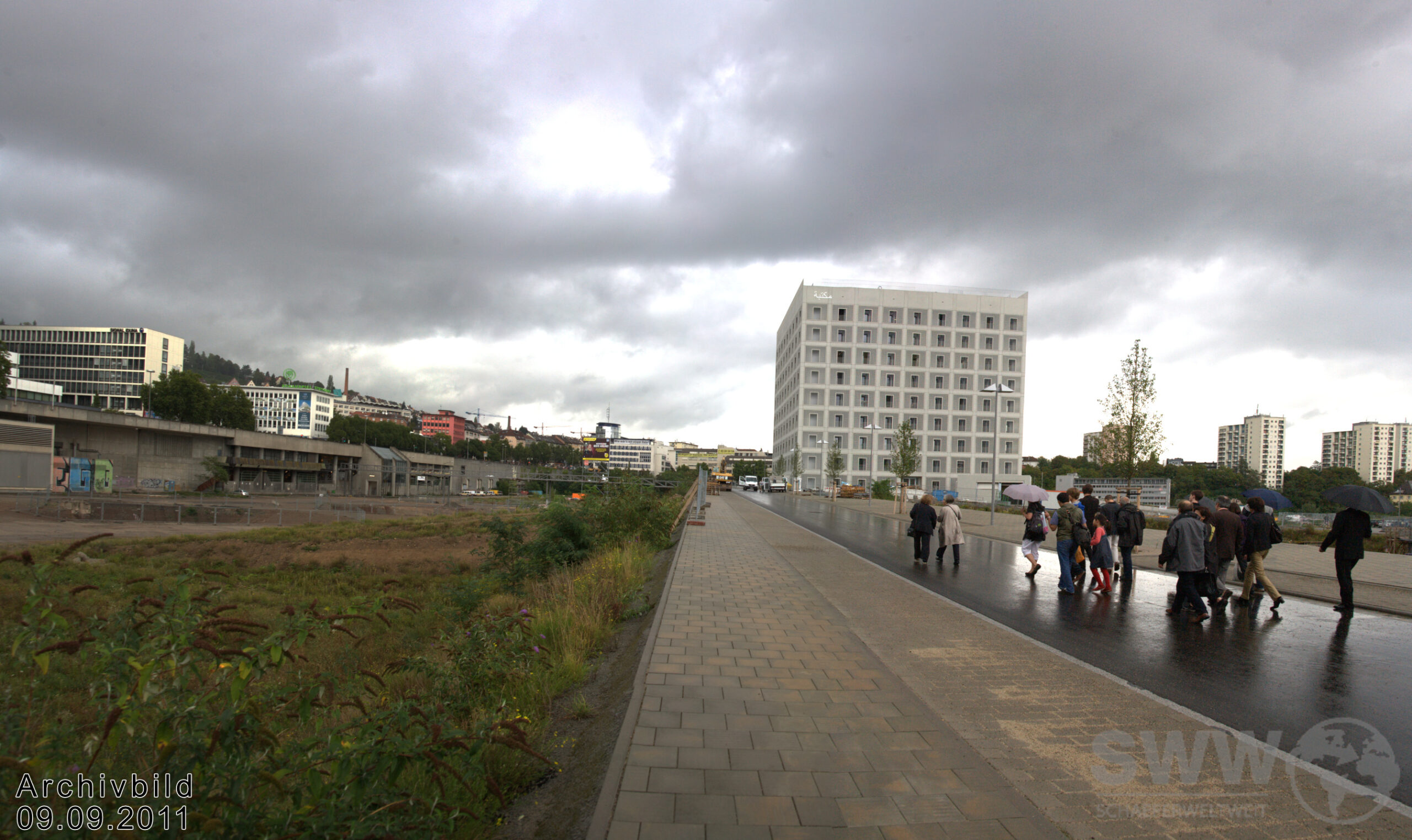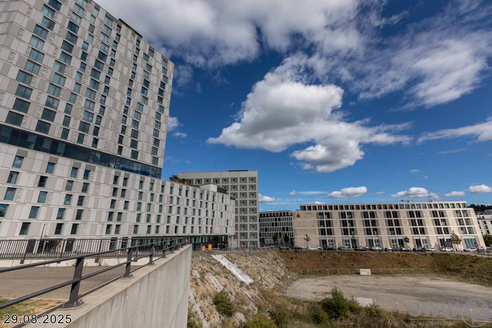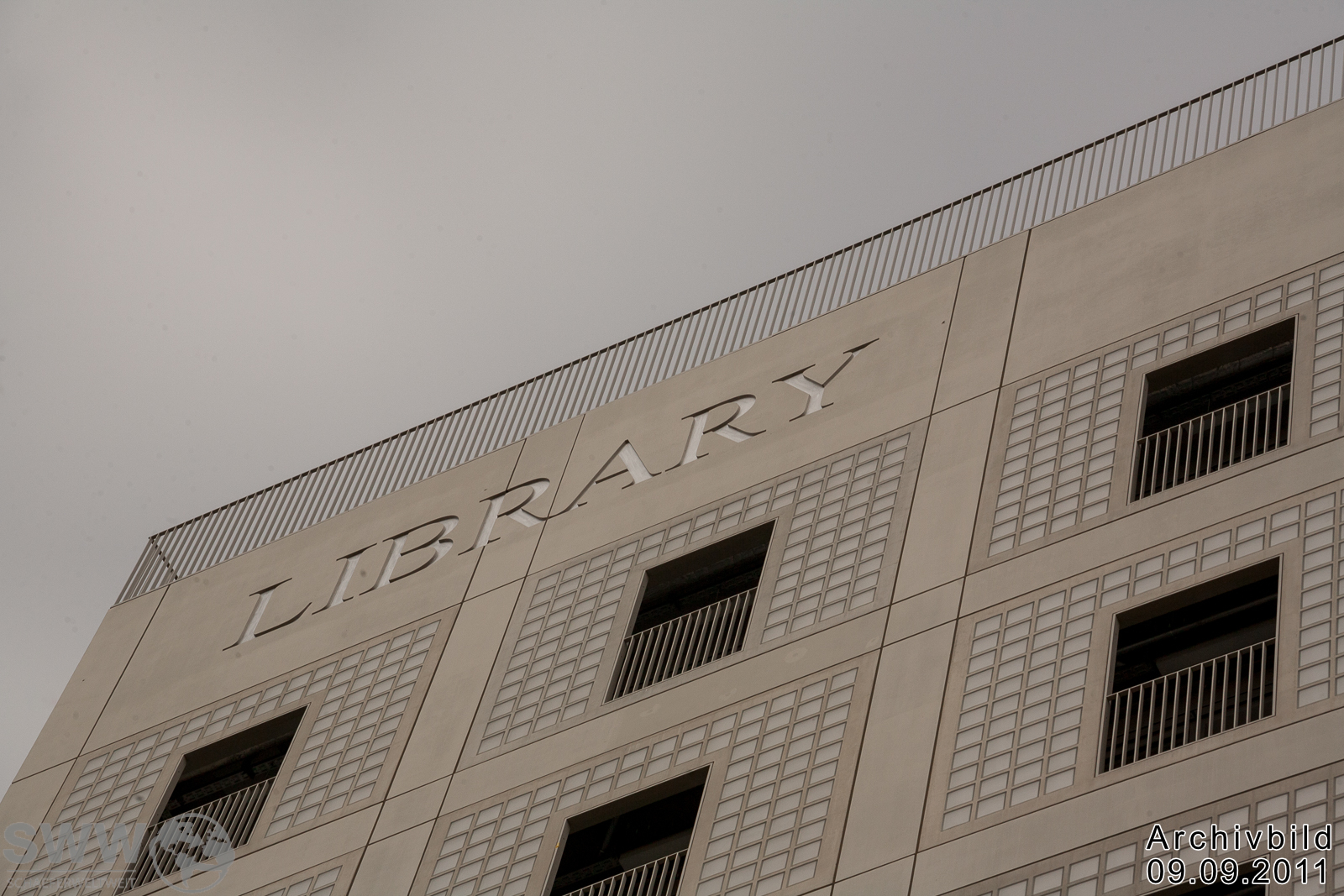 Mittlerweile ist das Umfeld der Stadtbibliothek durch zahlreiche Neubauten stark gewachsen. Die ehemals singuläre Präsenz auf dem „Berg“ ist heute von anderen Gebäuden umschlossen fast schon eingezwängt, sodass die Wirkung des monumentalen Solitärs deutlich verloren hat. Der einst herausragende Blick auf den markanten „Bücherwürfel“ über der Brachfläche ist überbaut, und die Architektur kann ihre imponierende Wirkung nicht mehr so entfalten wie zu Beginn – was allerdings ja durchaus geplant war. Die Stadtbibliothek wirkt nun eingebettet und erschöpft sich zunehmend im urbanen Kontext, was die (nachts blau leuchtende) Strahlkraft des Bauwerks meiner Meinung nach ziemlich schmälert.