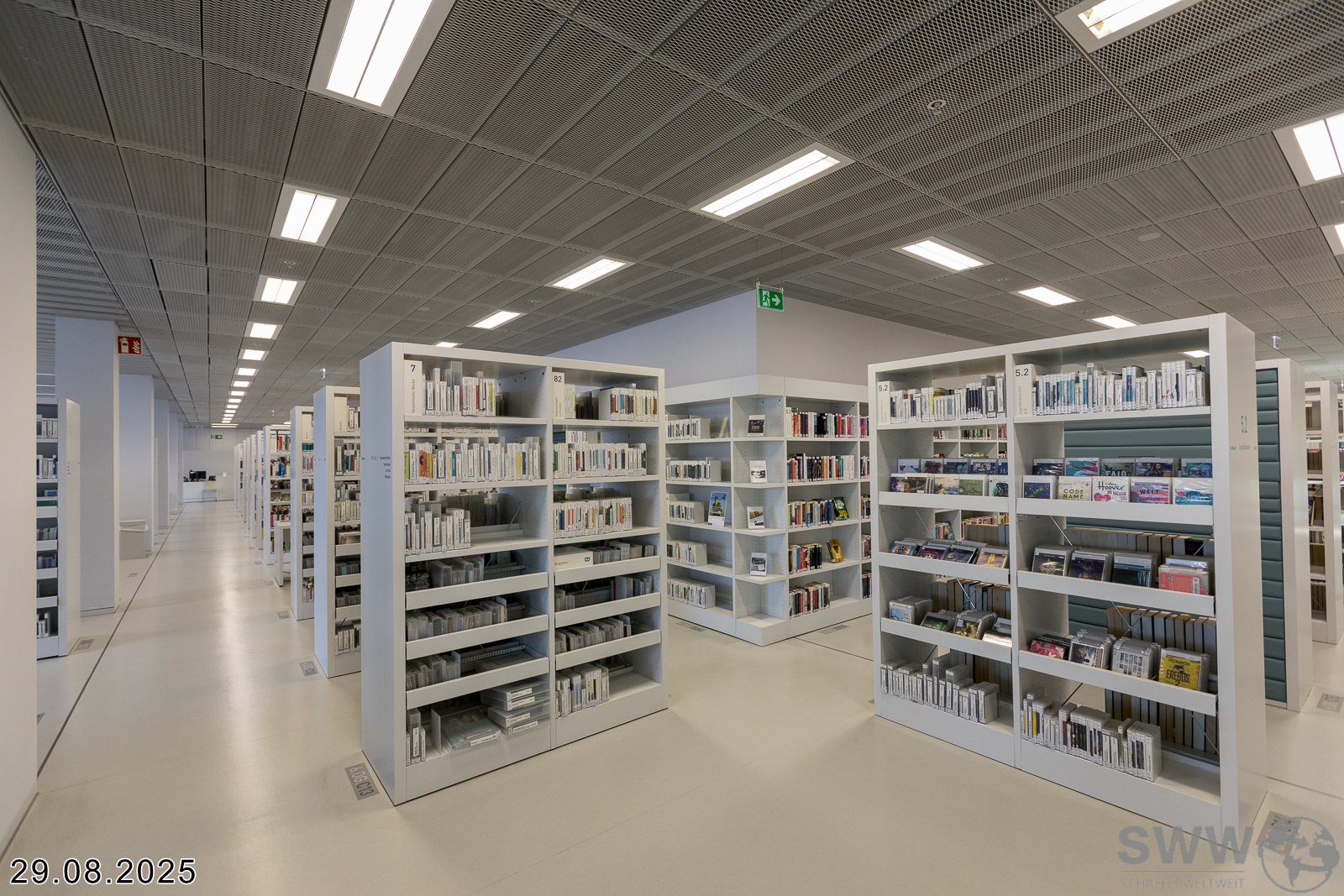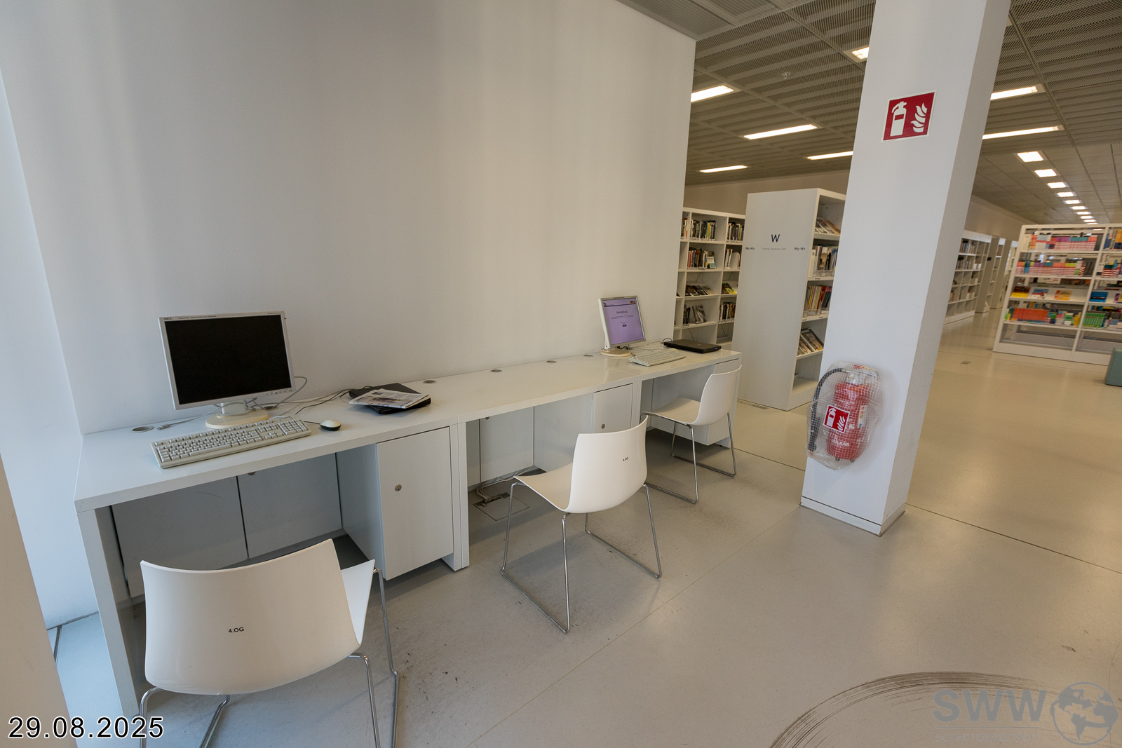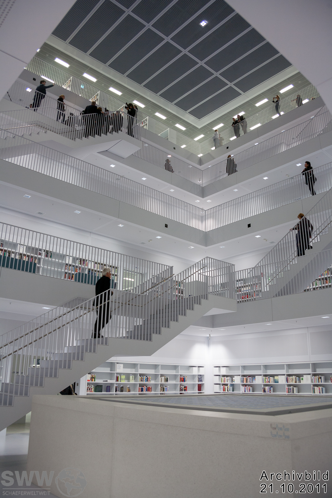 Im Inneren dominiert ein viergeschossiger, leerer, kubischer Raum – das „Herz“ der Stadtbibliothek – der mit seiner kargen Gestaltung eher an eine Ausstellung purer Architektur als an eine lebendige Bibliothek erinnert. Die Atmosphäre wird von manchen Besuchern als steril und wenig einladend empfunden, was dem eigentlichen Zweck einer Bibliothek als Ort der Begegnung und des Verweilens widerspricht. Die minimalistischen Linien und die reduzierte Materialwahl bringen zwar klare Ordnung und Ruhe, doch fehlt es dem Raum an Gemütlichkeit und Wärme. Das ursprünglich als belebendes Element gedachte Wasserspiel in seiner Mitte ist mittlerweile eher zum Sinnbild für die technischen Mängel des Gebäudes geworden, da es seit Anfang an bis heute ständig defekt und gesperrt ist.