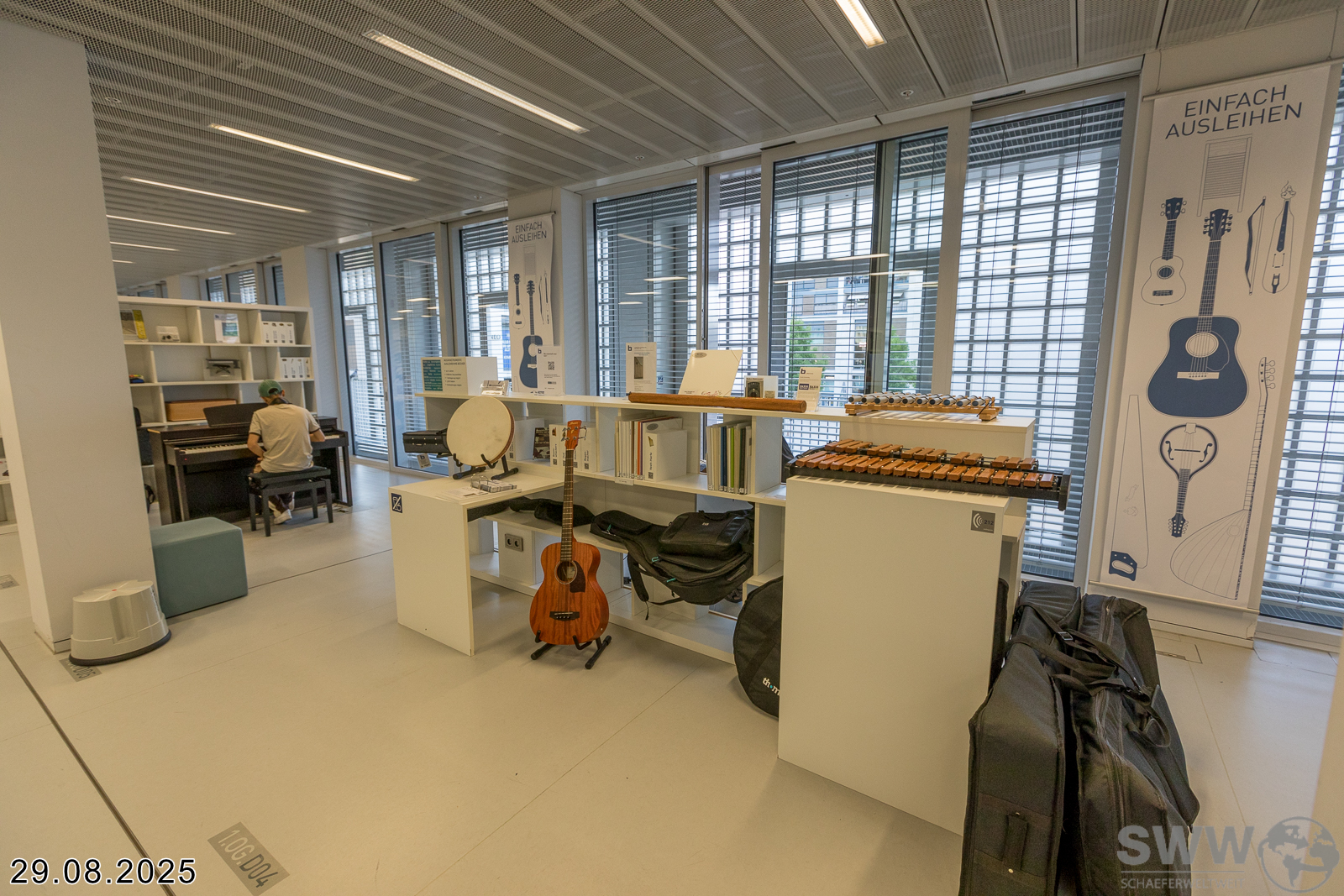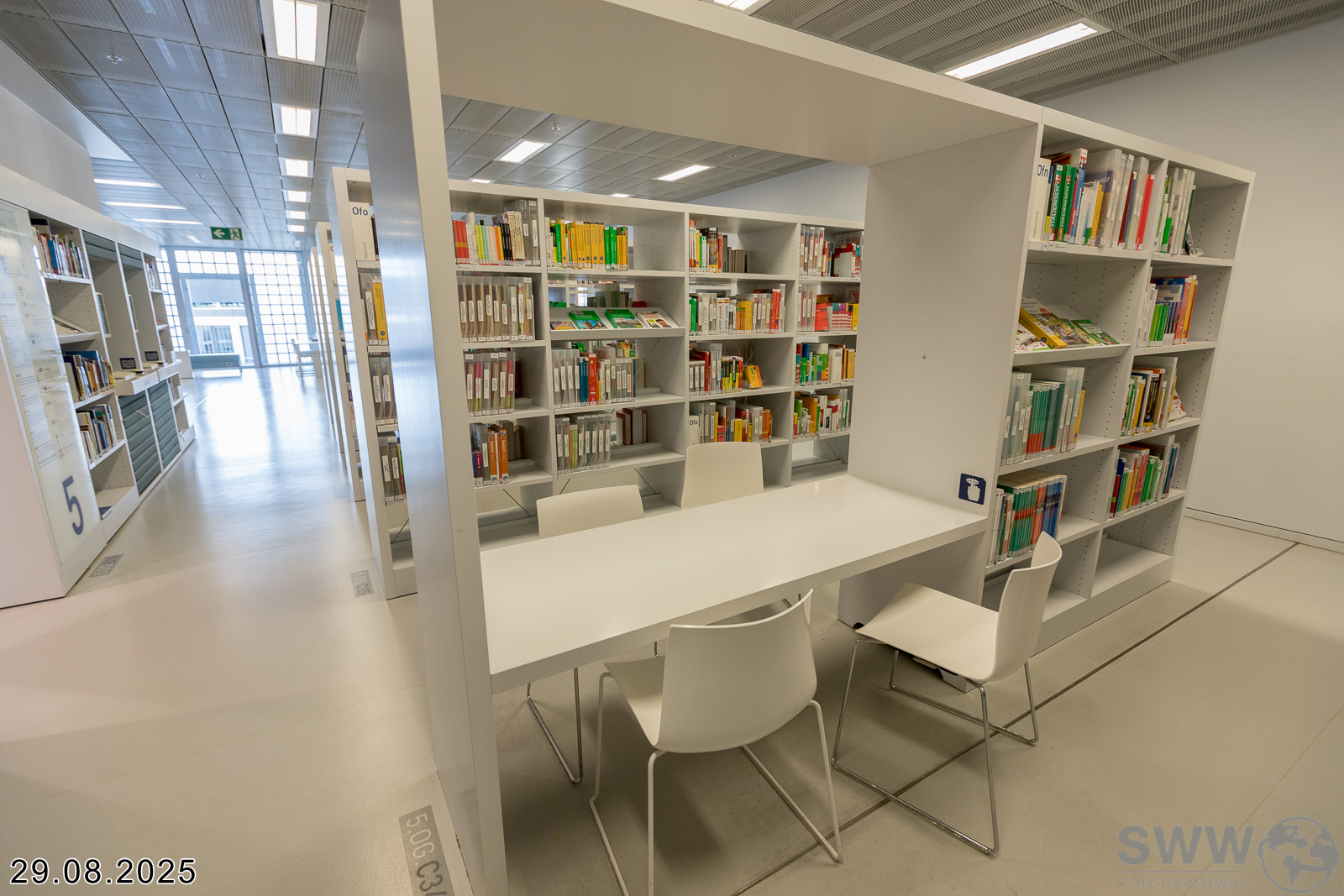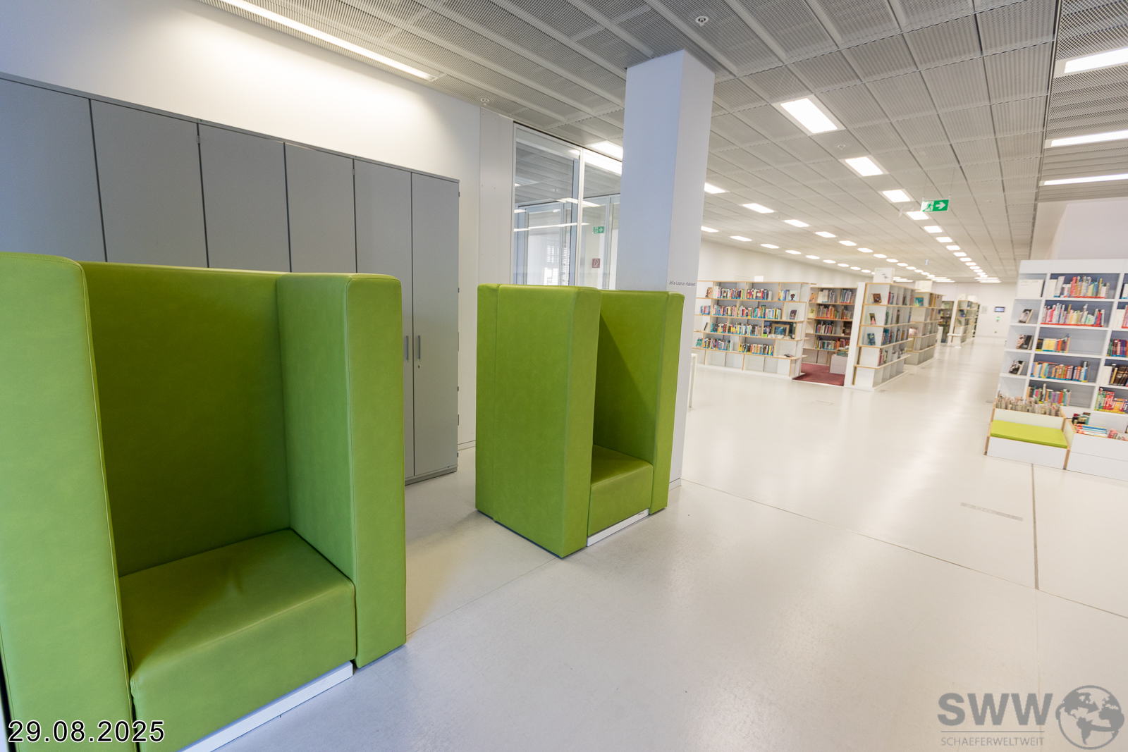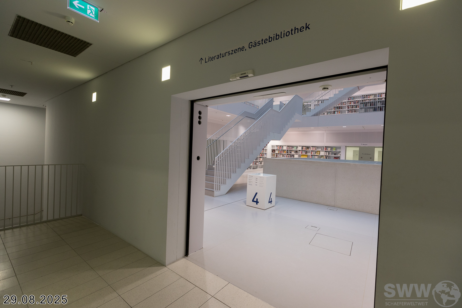 Im Inneren dominiert ein viergeschossiger, leerer, kubischer Raum – das „Herz“ der Stadtbibliothek – der mit seiner kargen Gestaltung eher an eine Ausstellung purer Architektur als an eine lebendige Bibliothek erinnert. Die Atmosphäre wird von manchen Besuchern als steril und wenig einladend empfunden, was dem eigentlichen Zweck einer Bibliothek als Ort der Begegnung und des Verweilens widerspricht. Die minimalistischen Linien und die reduzierte Materialwahl bringen zwar klare Ordnung und Ruhe, doch fehlt es dem Raum an Gemütlichkeit und Wärme. Das ursprünglich als belebendes Element gedachte Wasserspiel in seiner Mitte ist mittlerweile eher zum Sinnbild für die technischen Mängel des Gebäudes geworden, da es seit Anfang an bis heute ständig defekt und gesperrt ist.