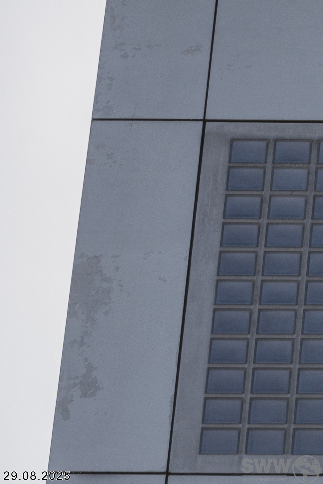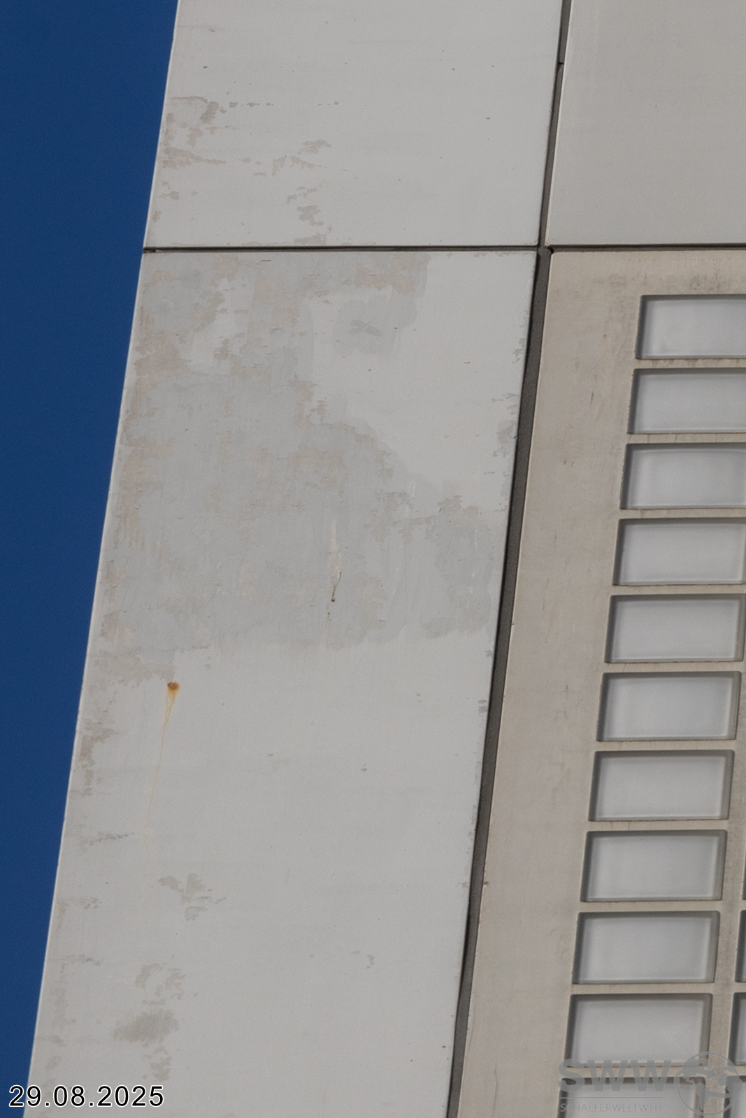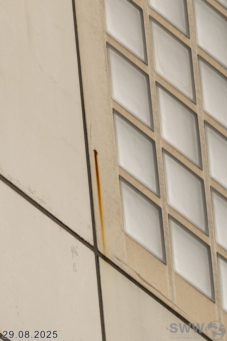 Ein weiterer kritischer Punkt ist der Rostbefall an der Beton- und Glasbausteinfassade. Bereits kurz nach der Eröffnung im Jahr 2011 traten erste Rostschäden auf, die immer wieder Reparaturen und Sanierungen notwendig machen. Rostspuren und braune Abläufe trüben das Erscheinungsbild des ansonsten optisch beeindruckenden Würfelbaus.