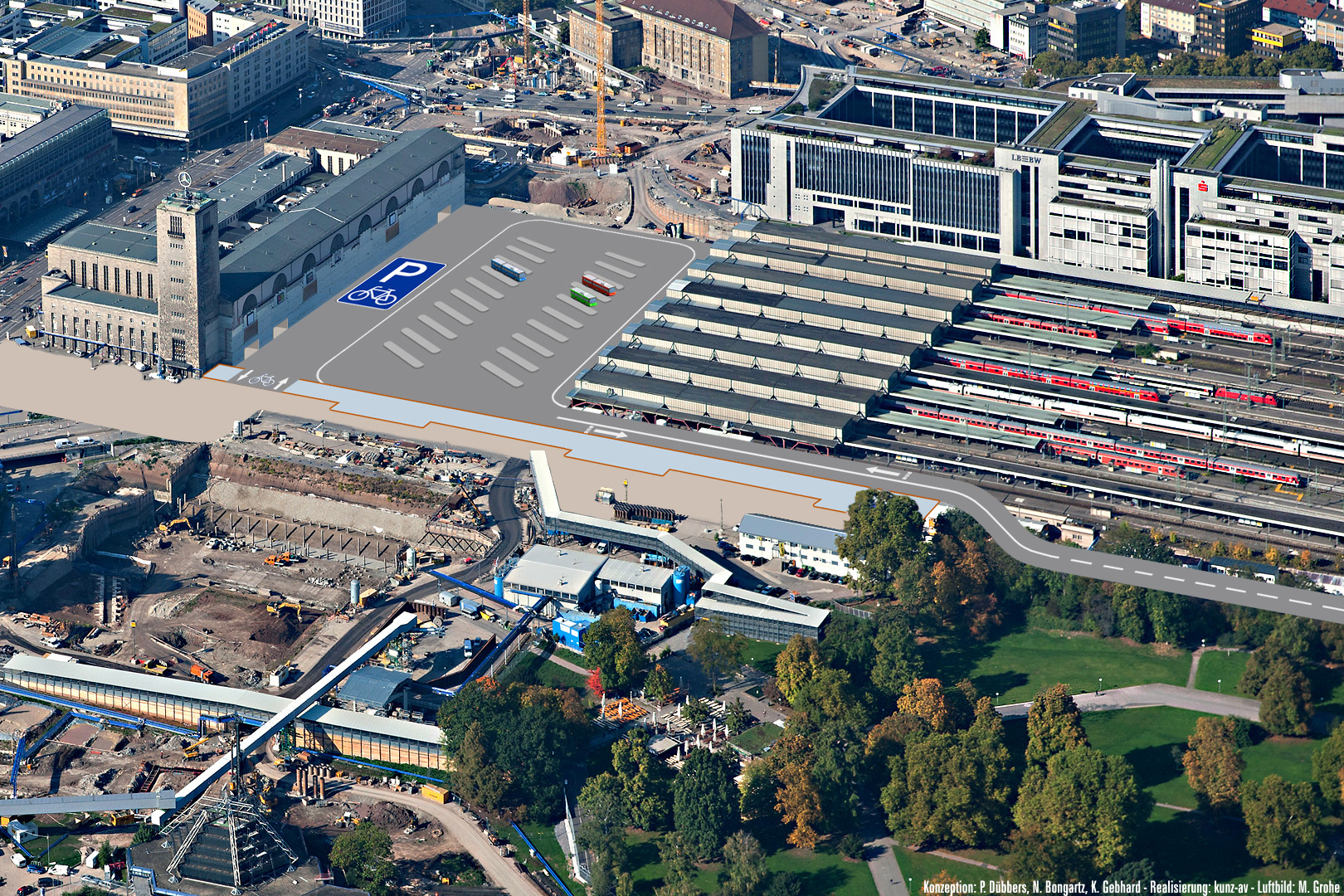 Im Gegensatz zu S21, endlich wieder ein wirklich Zentraler Busbahnhof entsteht. Dieser würde dann sofort jetzt und direkt unter die Gleise gelegt. Hier wird die jetzt schon erstellte Grube genutzt also kann sofort umgesetzt werden! Dazu kommen dann noch eine Parkplatzebene incl. Fahrradplätze direkt vor Ort mit der Zufahrt von der jetzt schon vorhandenen Einfahrt zum Parkhaus „Hotel am Schlossgarten“ und ebenso über eine Rampe von der Nordseite aus! (ungefähr so wie zur Zeit jetzt schon die Rampe der Baustraße)
