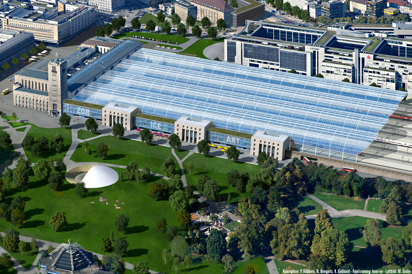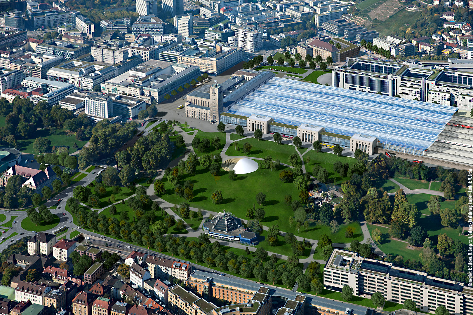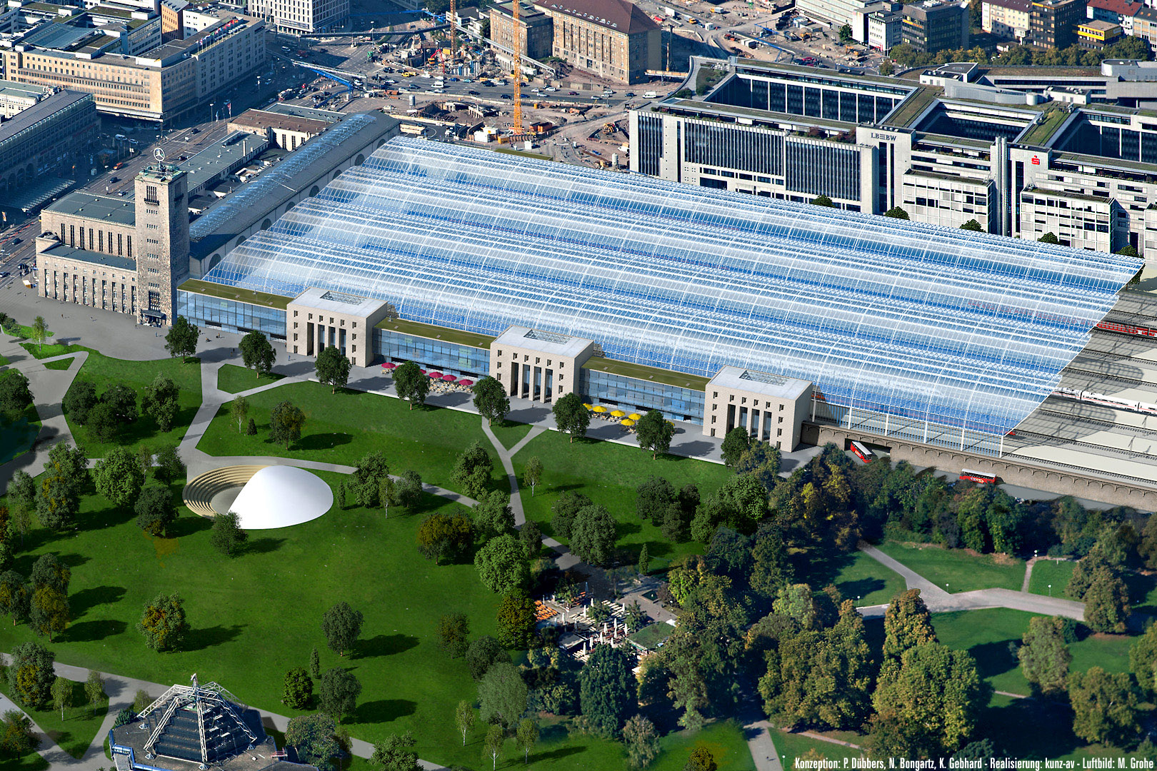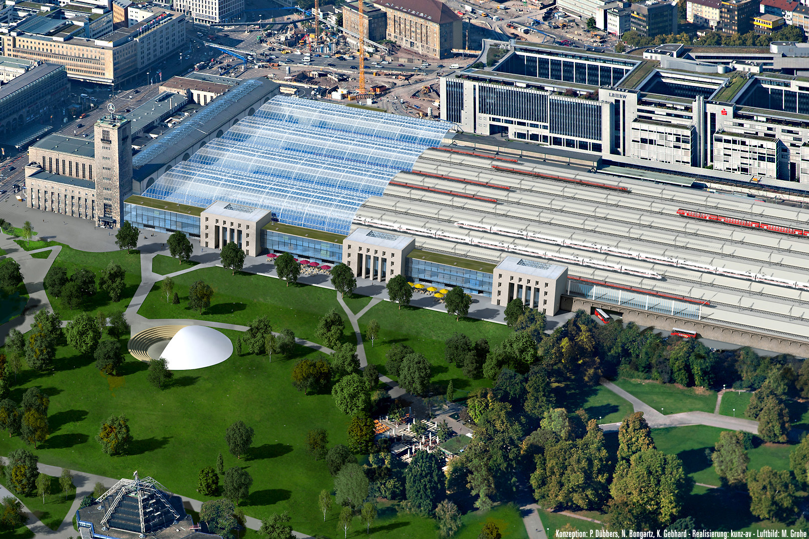 Gesamtansicht des sanierten und modernisierten Kopfbahnhofs sowie des wiederhergestellten Mittleren Schlossgartens inkl. Kreisverkehr am Gebhard-Müller-Platz.