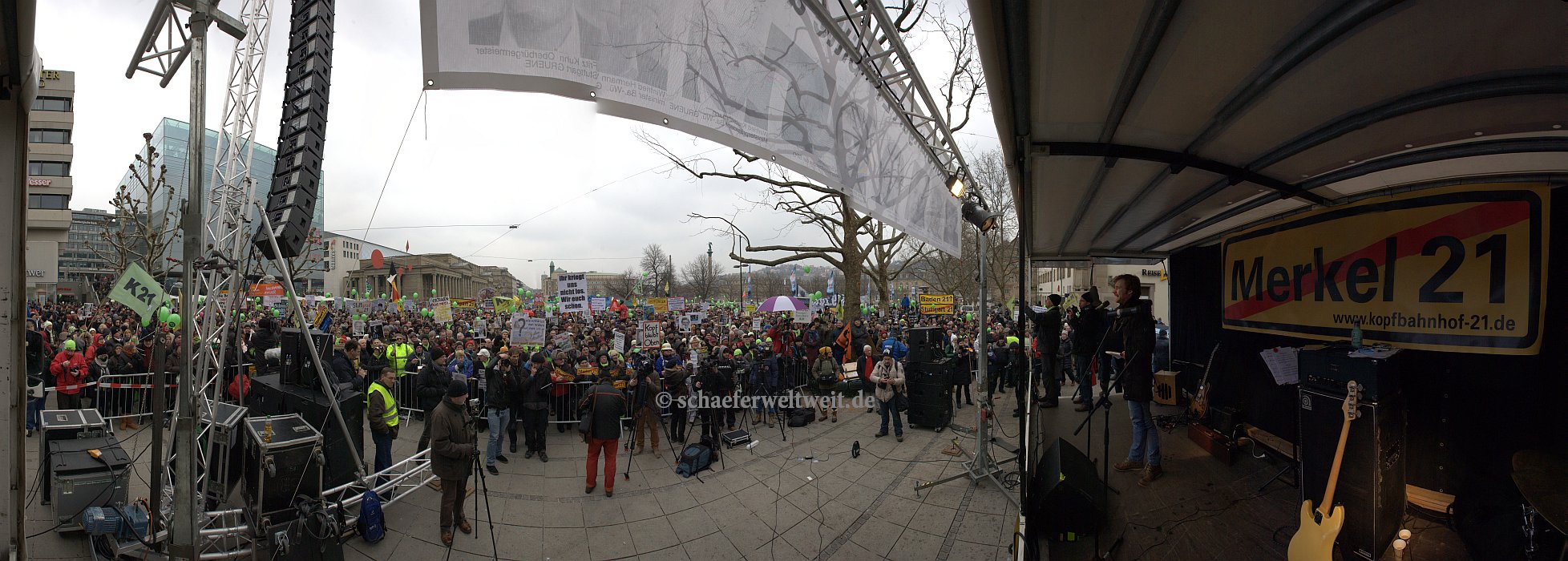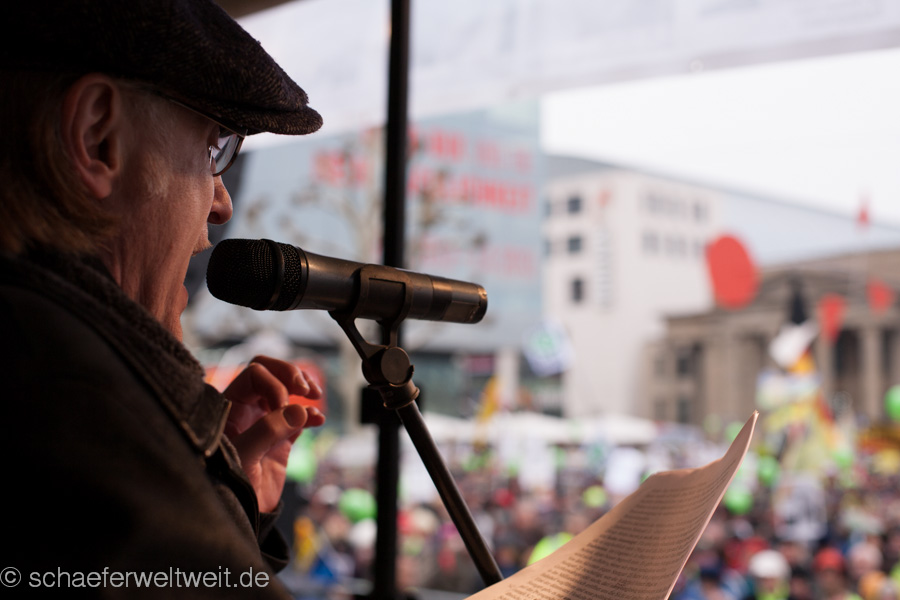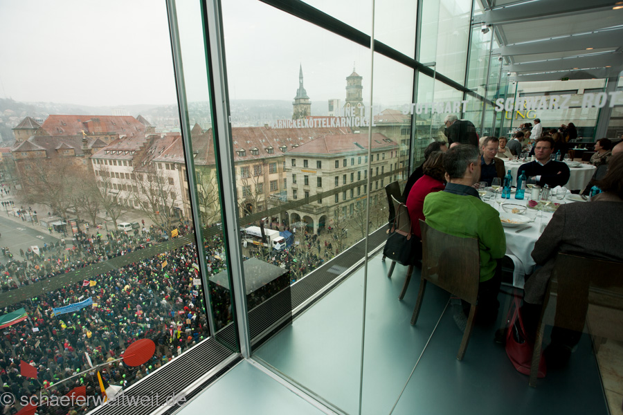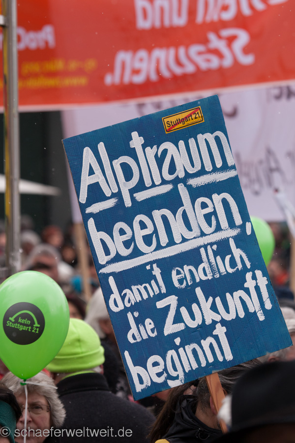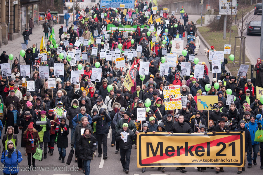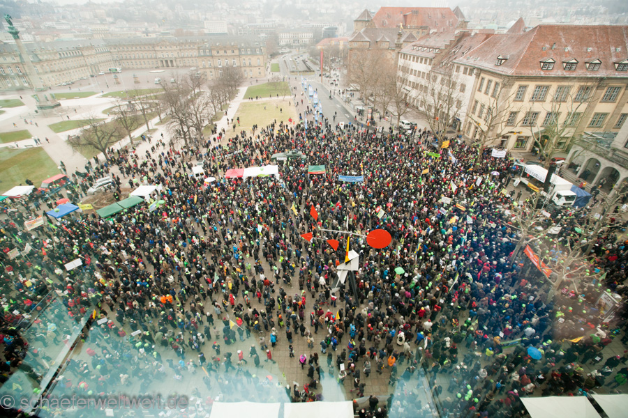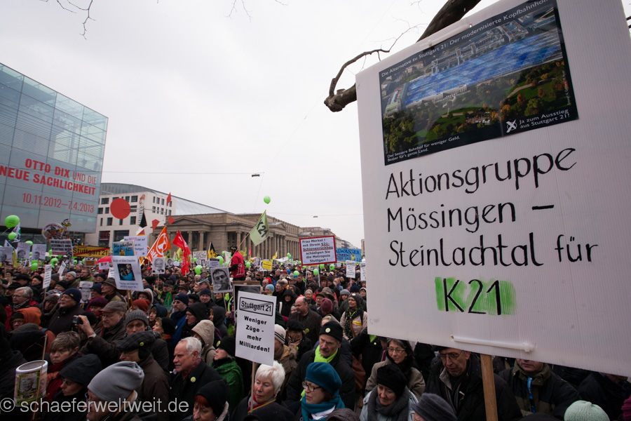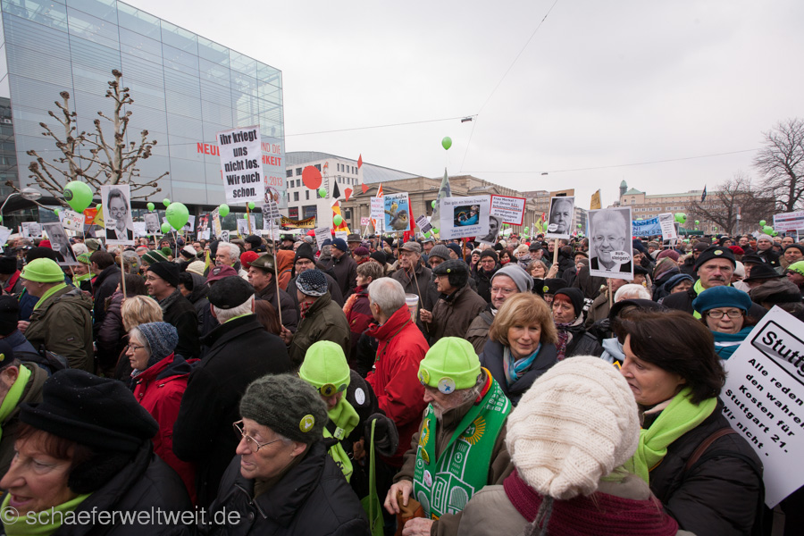 (23.02.13) Samstagsdemo in Stuttgart und es strömen die Massen. Tausende sind wieder trotz eisiger Temperaturen erschienen, um zu zeigen, dass der Druck gegen den Bahnsinn21 ungebrochen ist. Neben den Rednern Franz Alt (Journalist) und Joe Bauer (Kolumnist) traten auch einige länger nicht gehörte Vertreter der Bewegung gegen S21 wieder aufs Podium. Brigitte Dahlbender (BUND), Peter Pätzold (Grüne) und Hannes Rockenbauch (SöS) zeigen durch ihre Anwesenheit, dass Wahlen ihre Vorboten voraus senden und ebenso dass dieses sehr flüchtige öffentliche Aufsehen nun wieder einen kurzen Höhepunkt erreicht.