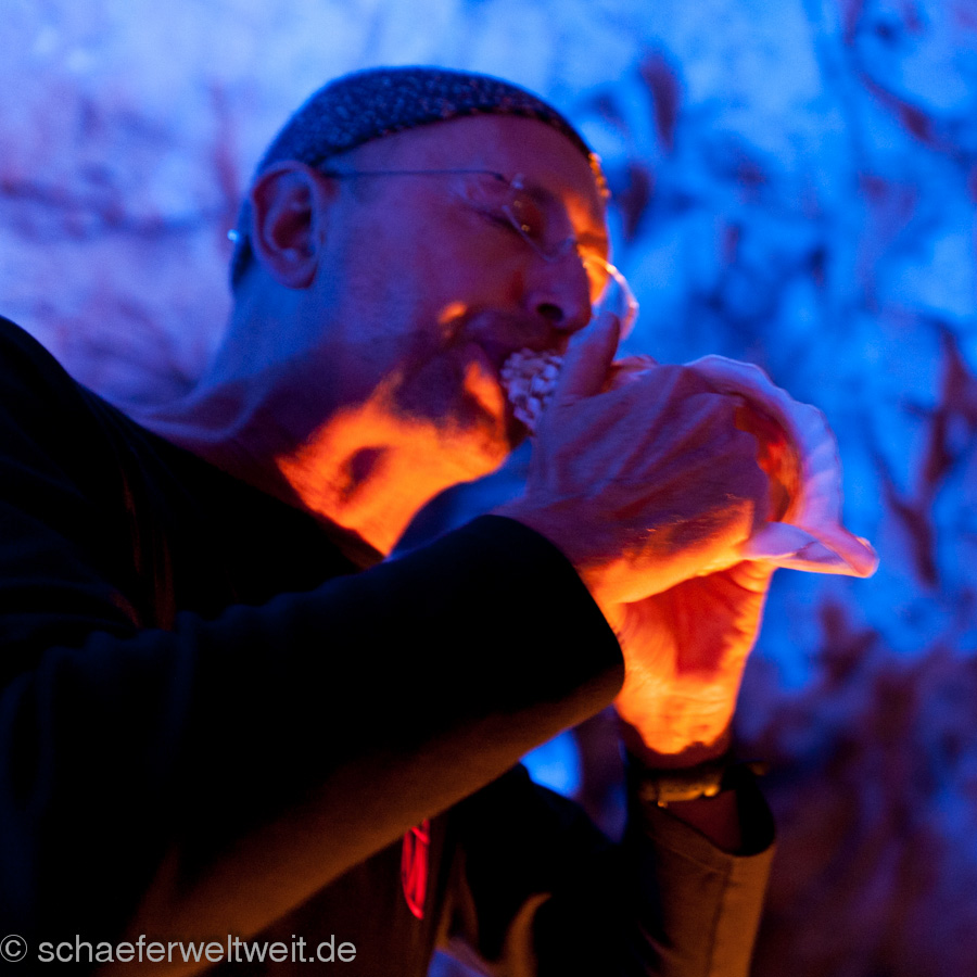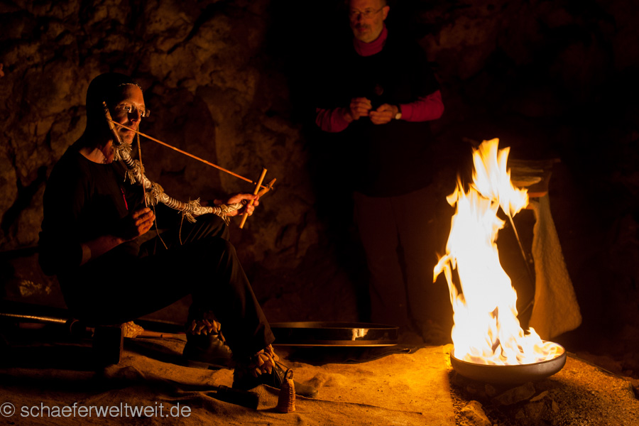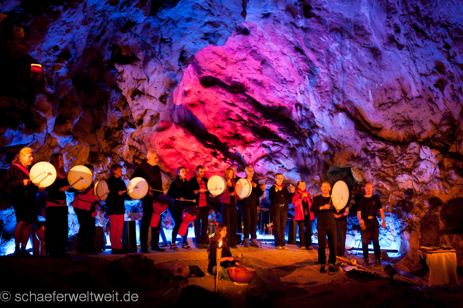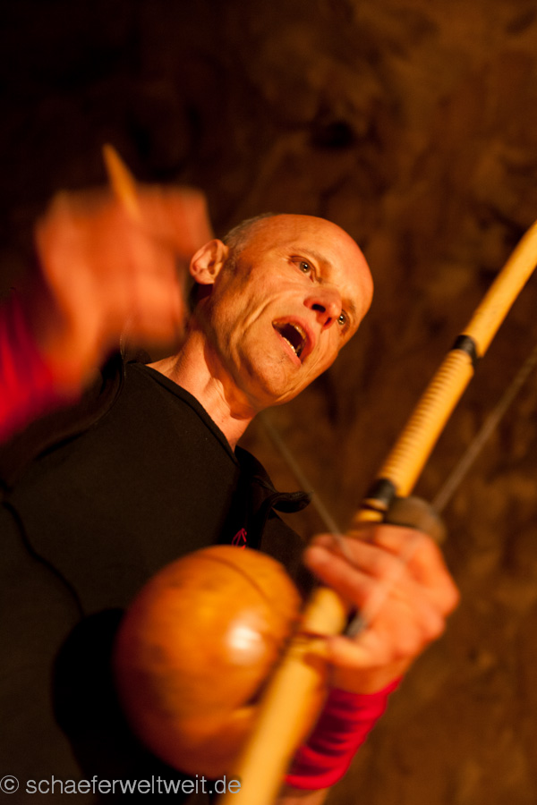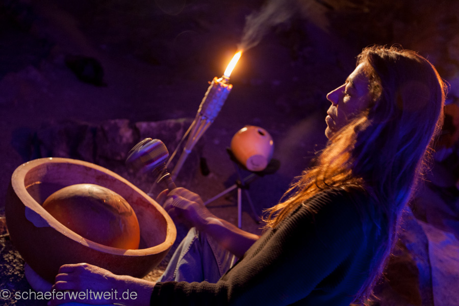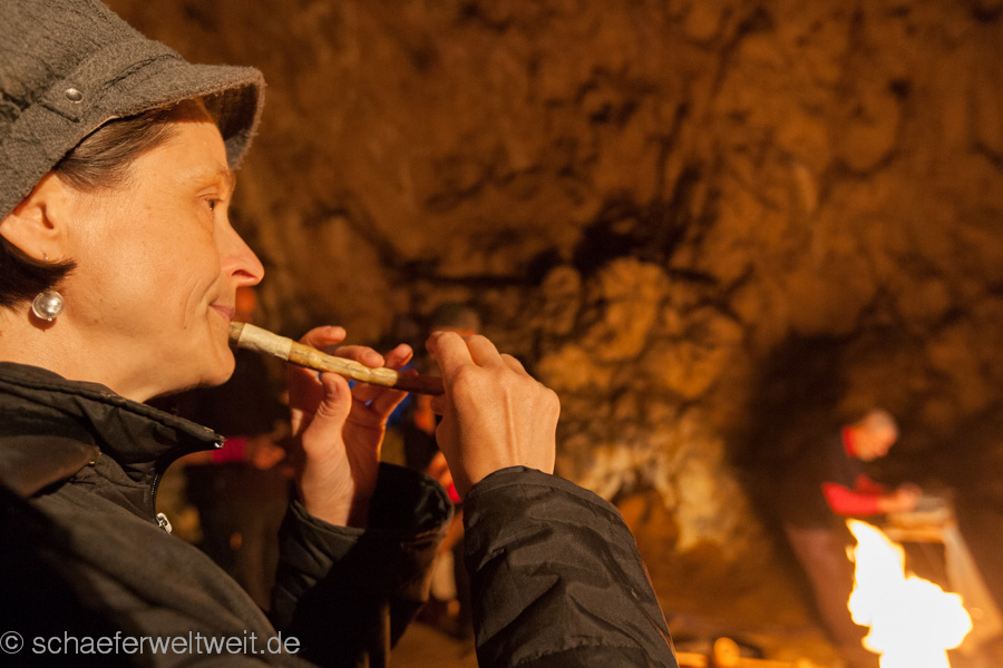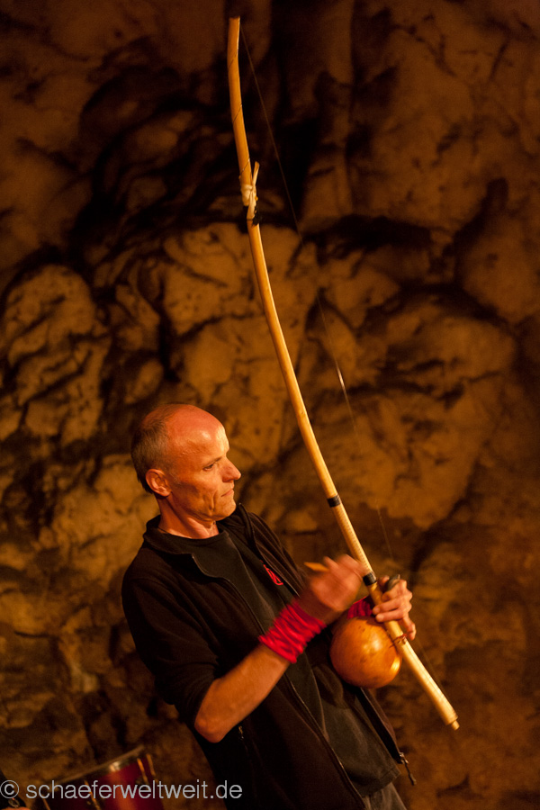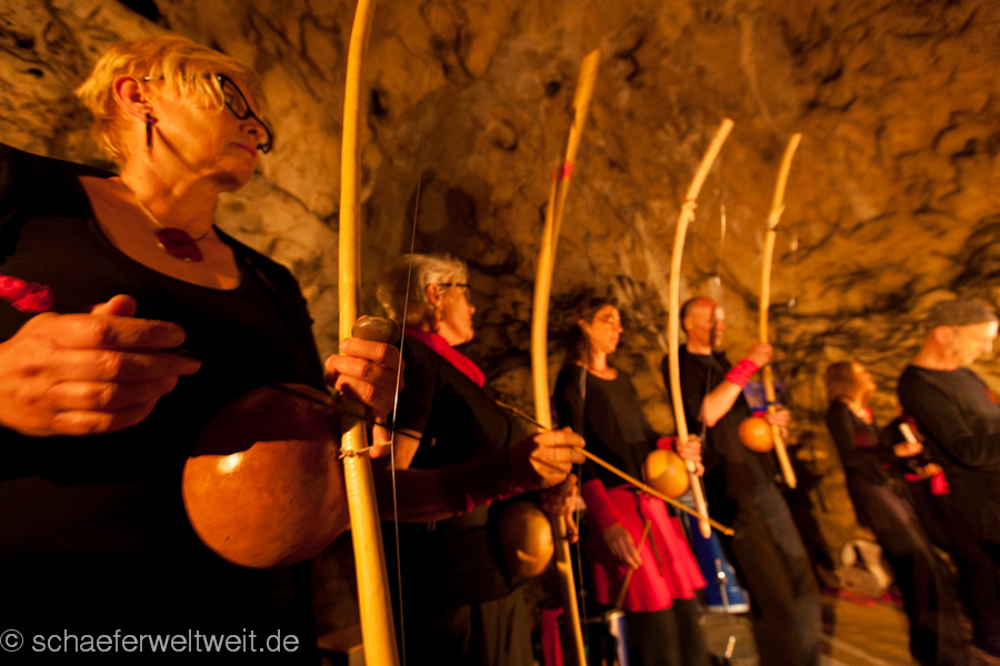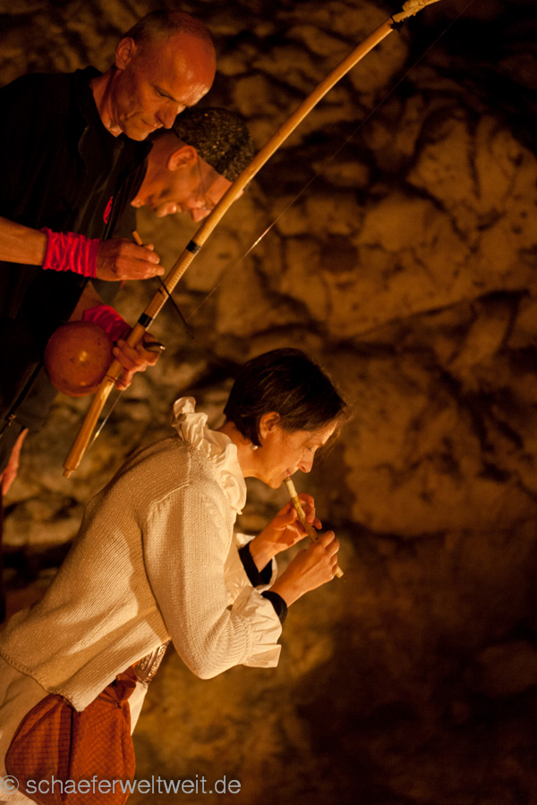 eine Flöte aus einem Geierflügelknochen. In der einzigartigen Akustik der großen Höhle entfalten die archaischen Klänge von Musikbögen, Stampfrohren, Rasseln, Rahmentrommeln, Schwirrhölzern, klingenden Steinen, eiszeitlichen Flöten, Muschelhorn und Gesang einen ganz besonderen Zauber. Sogar die Höhle selbst wird zeitweise selbst zum Musikinstrument und direkt zum klingen gebracht.