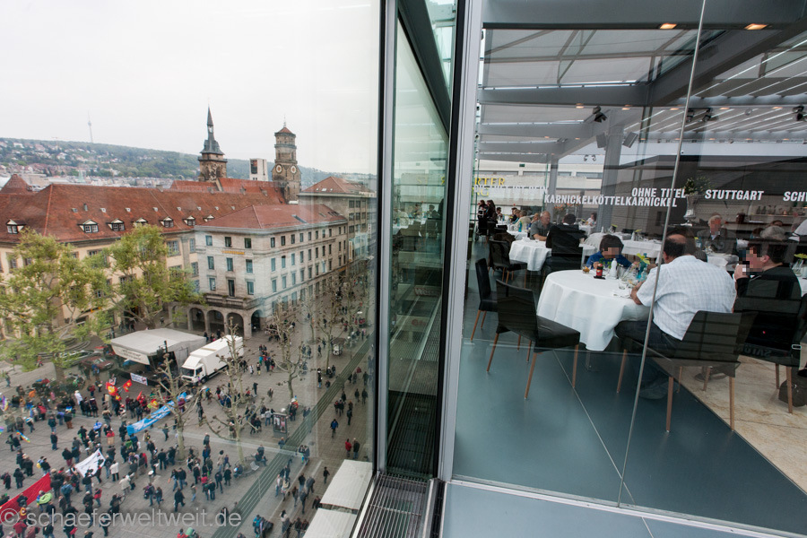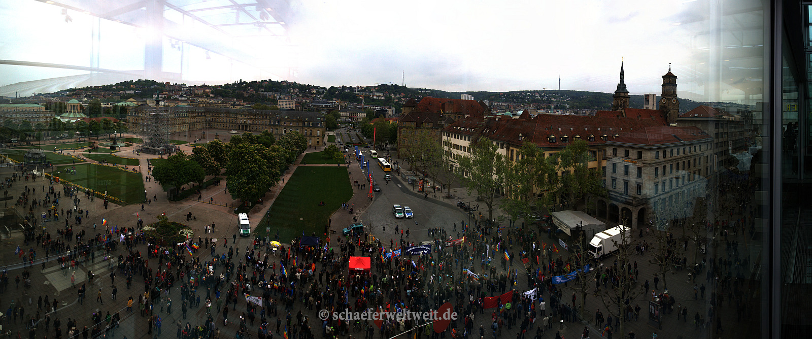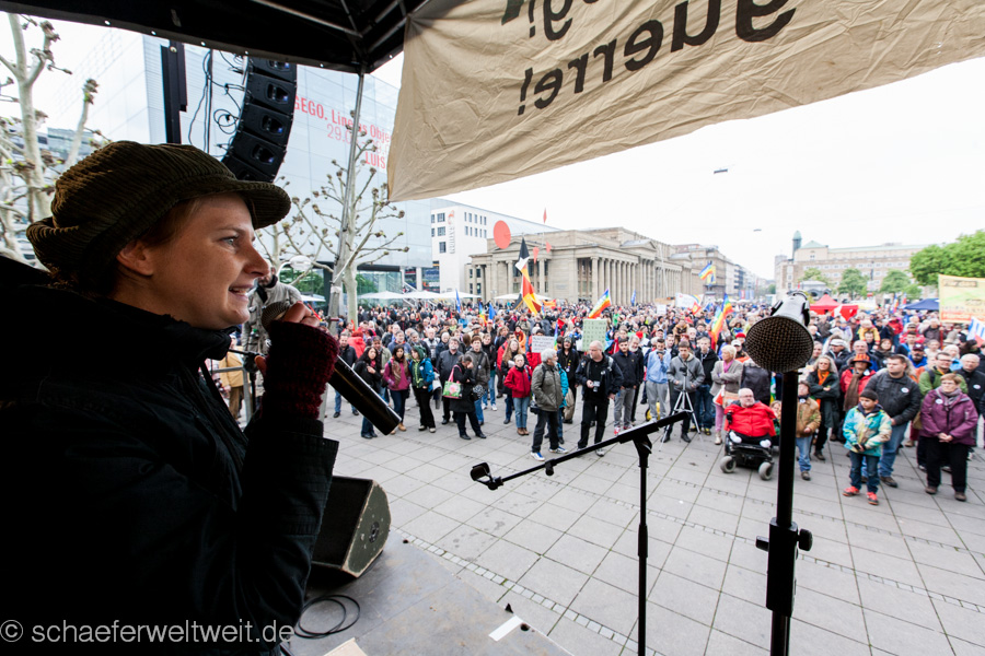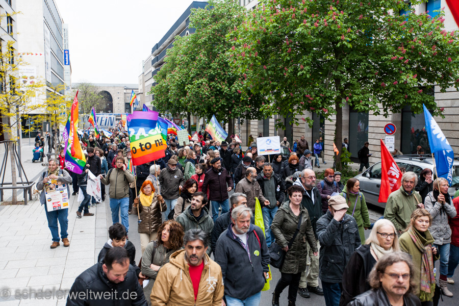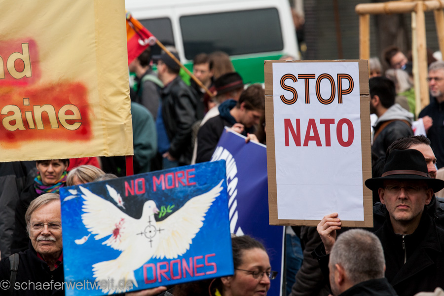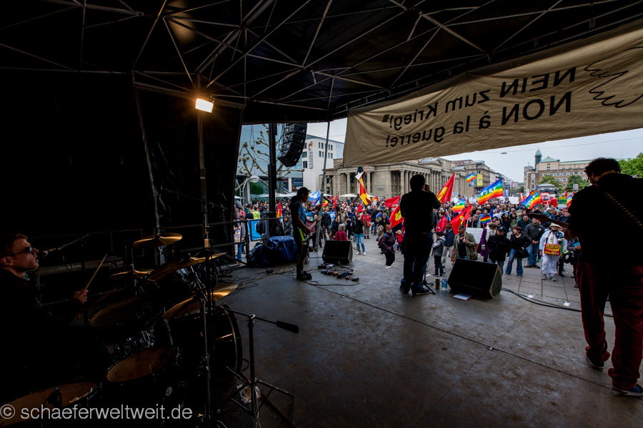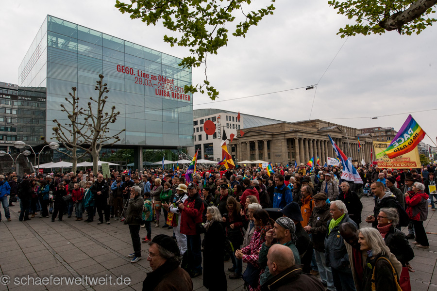 Unter dem Motto: „100 Jahre Erster Weltkrieg, 75 Jahre Zweiter Weltkrieg, 15 Jahre Kriegseinsätze der Bundeswehr: Sagt Nein zu Krieg!“ startete der sog. Ostermarsch am „AFRICOM“ in Möhringen und führte über eine Zwischenkundgebung in der Lautenschlagerstraße zum Stuttgarter Schlossplatz.