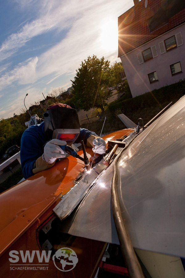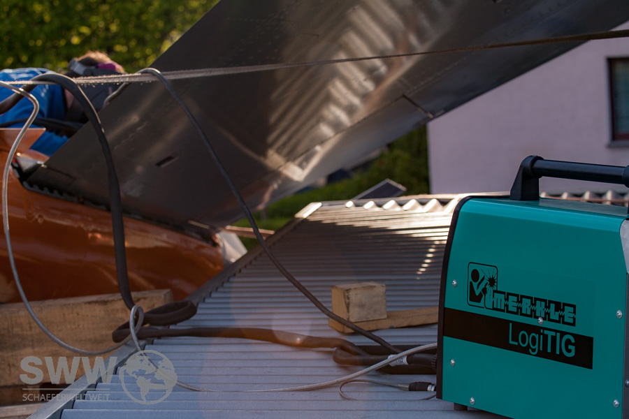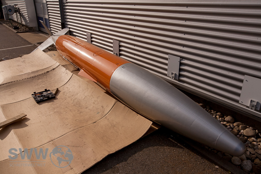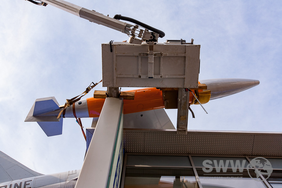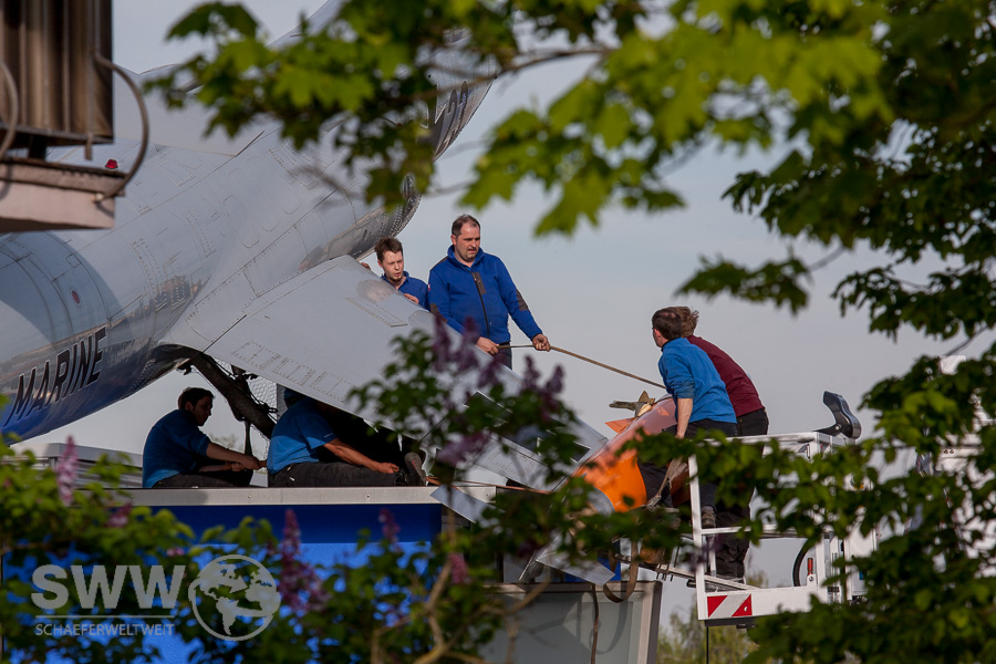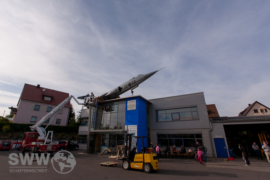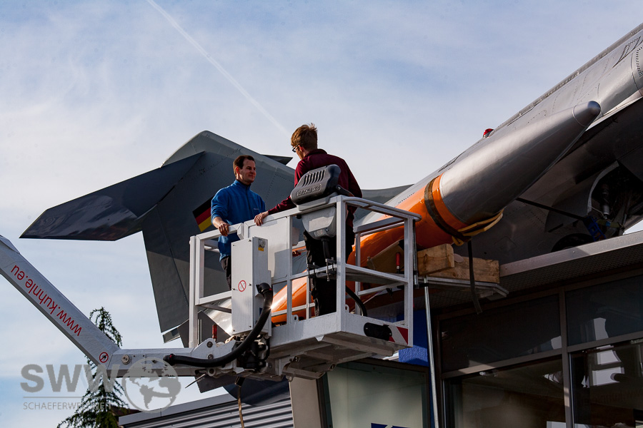 Nachdem der Zuffenhäuser Starfighter (link) nun schon über ein Jahr auf der Fabrikhalle der Firma Merkle steht, wurden am 17.04.14 zwei „abwerfbare Flügelspitzen-Zusatztanks“ (tip-tanks) nachgerüstet. Damit, so Hartmut Rehorsch, ist der Starfighter nun komplett. Diese Zusatztank sorgten im Einsatz dafür das aus ca. 15 Minuten über eine Stunde Flugzeit wurde.