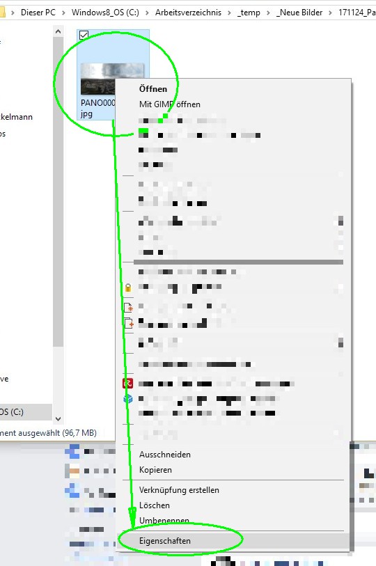 1.11. Soll das Panorama ein Kugelpanorama auf Facebook werden dann müssen noch die Exif überschrieben werden: Windows-Explorer -> Dateieigenschaften -> Details -> Kammerahersteller und Kameramodell mit RICOH und RICOH THETA S überschreiben