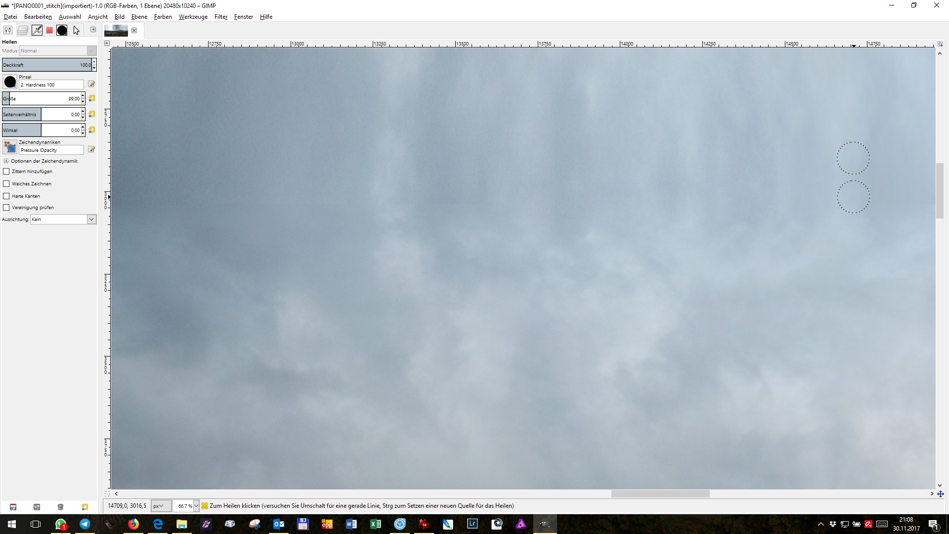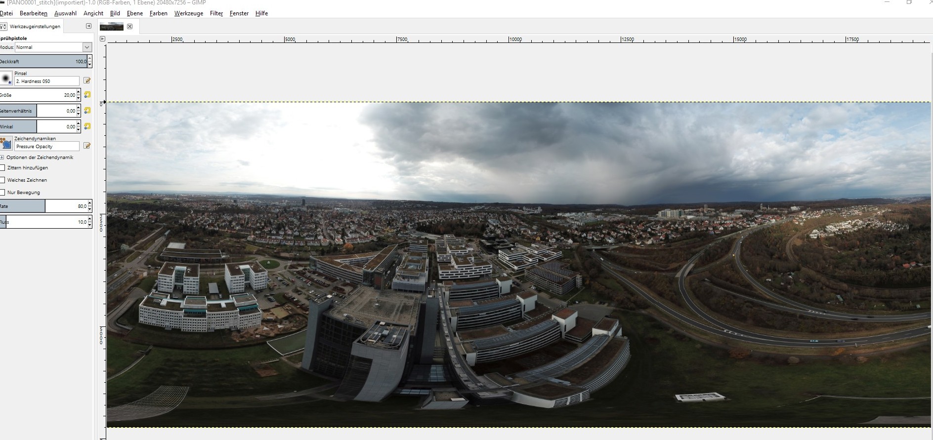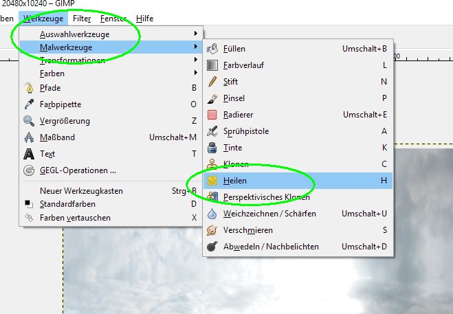 Beispielhafte Überarbeitung des Zenit (des Himmels gerade nach Oben / der Bereich in dem der Copter der Kamera im Weg war) mit Affinity Photo (keine Freeware) oder vergleichbarer Software wie zb. Adobe Photoshop
