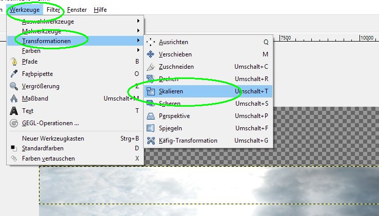 1.8. Himmel auswählen – nach oben spiegeln – verzerren bis der Himmel ausgefüllt ist – Übergang „Heilen“.