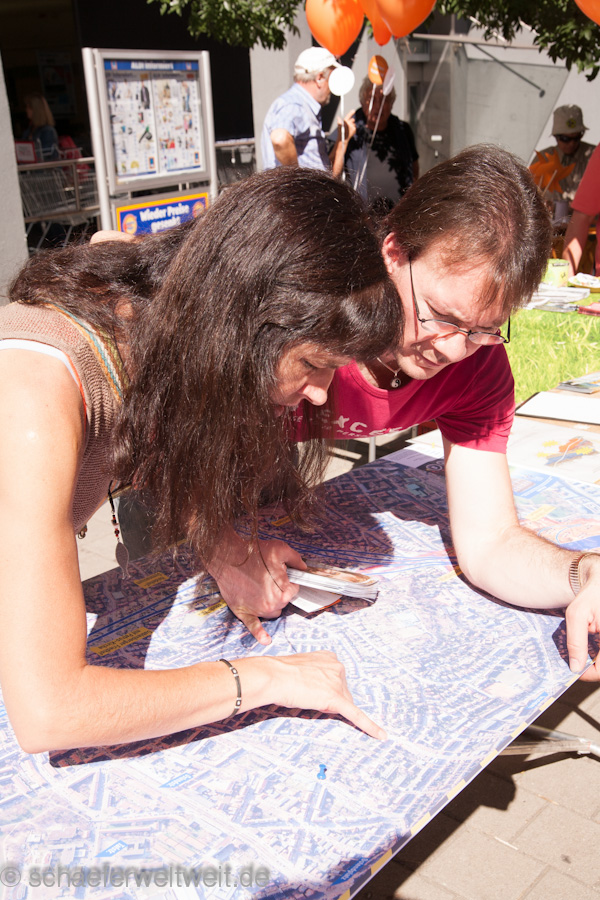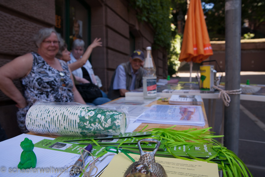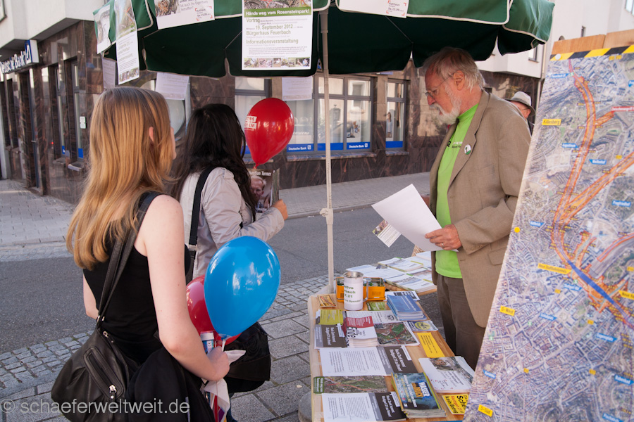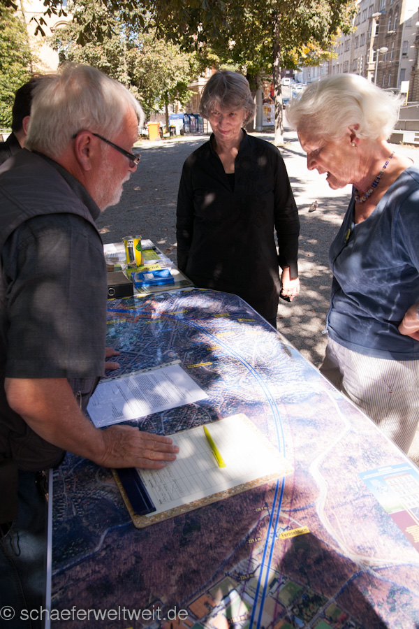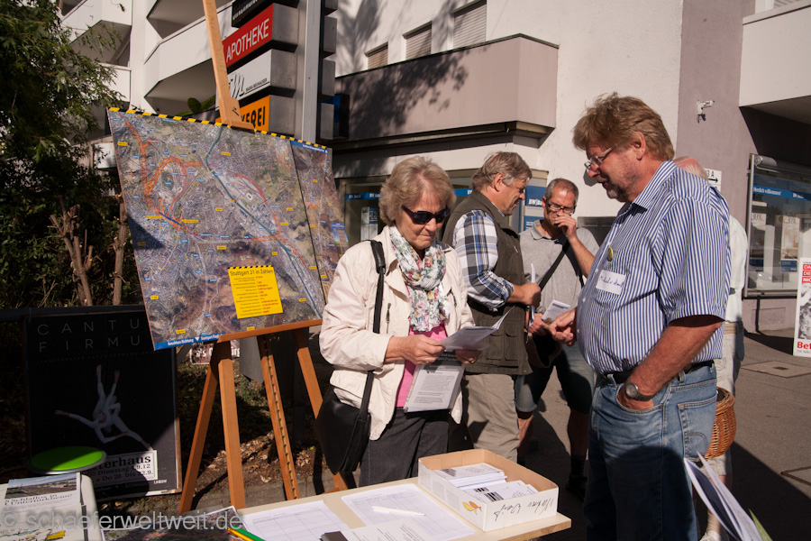 Ich besuchte 13 der Infostände mit der Kamera und dokumentierte die Aktionen mit denen über allerlei Themen rund um das Immobilienprojekt Stuttgart21 informiert wurde. Teils waren die Infostände sehr geschickt gewählt indem sie genau über den geplanten Tunnelröhren standen. Das Interesse war erstaunlich groß und so maches überraschte Gesicht beim betrachten der detaillierten Tunnelkarten (Originale der DB) zeigte das erstaunlicherweise noch sehr viele Menschen nicht wissen über was sie bisher abgestimmt hatten. Das direkt unter ihren Wohngebieten Tunnel gebohrt oder gesprengt werden. Das überrascht in sofern da man ja wenn man der DB glauben schenkt davon ausgehen sollte das wesentlich mehr als nur die Stuttgarter nun angeblich bestens informiert sein sollen. Man fragt sich auf welchem (nicht)Wissenstand da dann die anderen Baden-Württemberger abgestimmt hatten, deren Antwort auf ein Finanzierungsdetail mittlerweile für alle möglichen Ausreden der rot/grünen Politik und der DB herhalten muß.