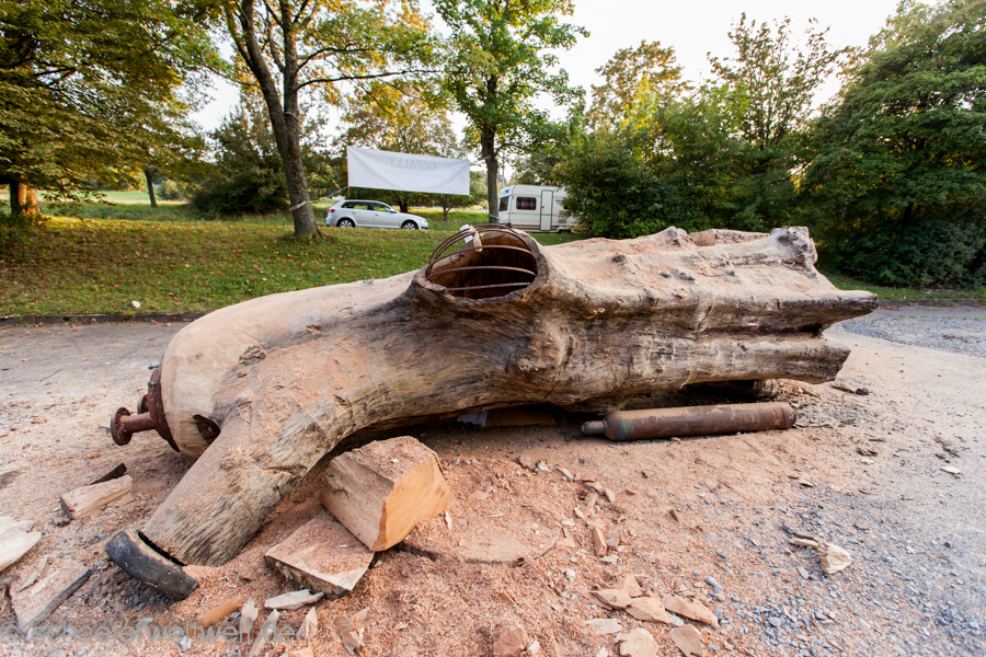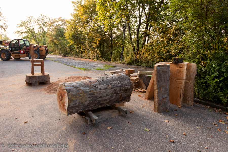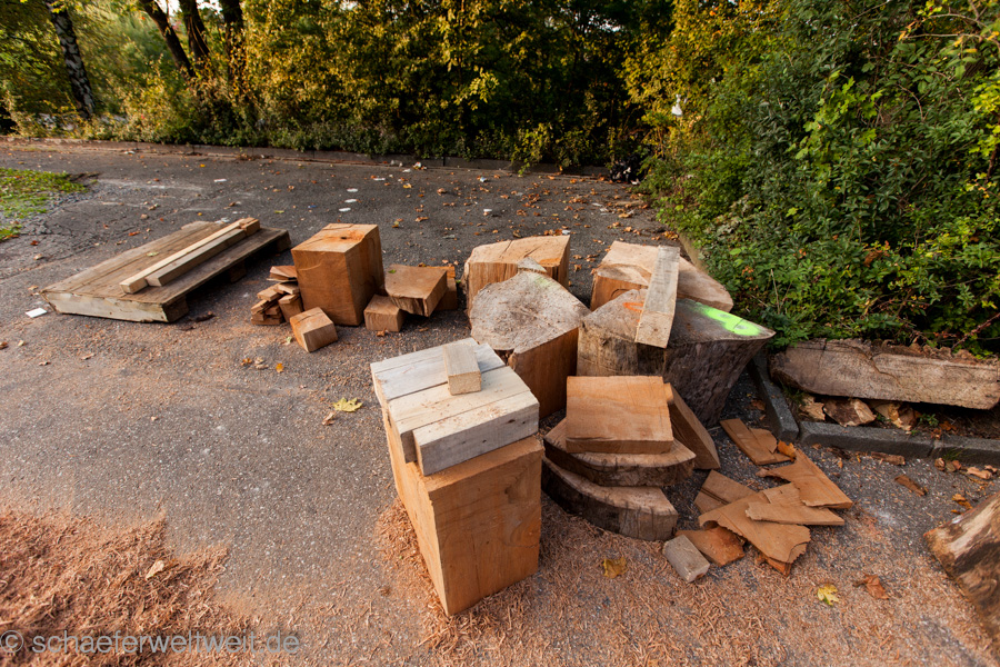 Neun davon zogen sie aus den lagerplätzen und zersägten sie zu „Kunst“. Statt ihnen wenigstens das bishen Würde zu lassen das die Fällmaschienen der Bahn ihnen nicht schon von der Borke gerissen hatte, mußten sie her halten für eine Show die kein Bürger annahm. Fast keine Besucher gaben sich die Blöse dieser öffentlichen Leichenfledderei beizuwohnen. Selbst zur „Vernissage“ am letzten Samstag nicht.