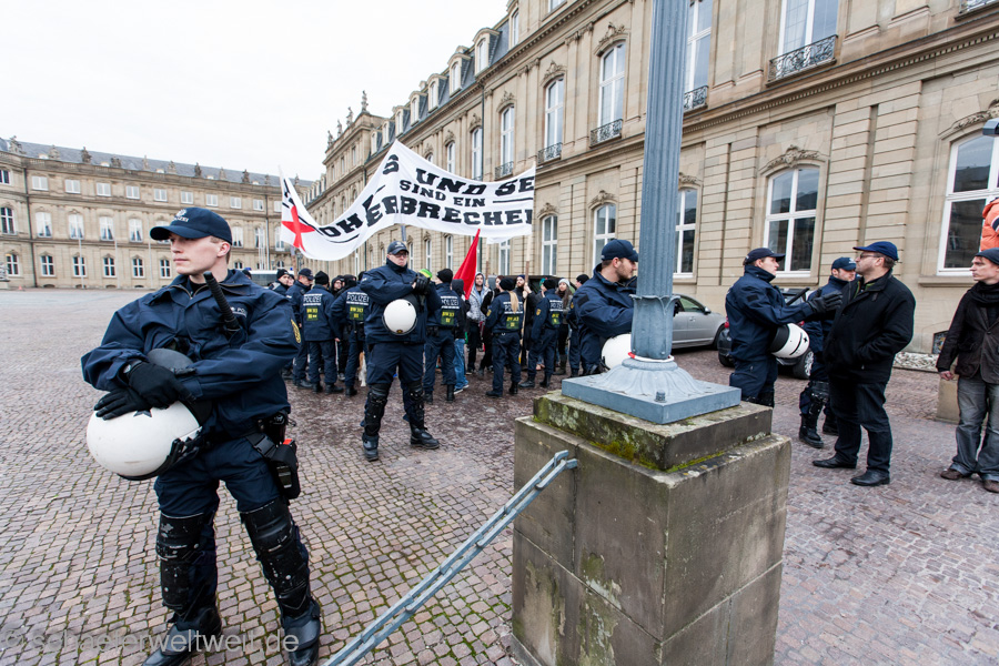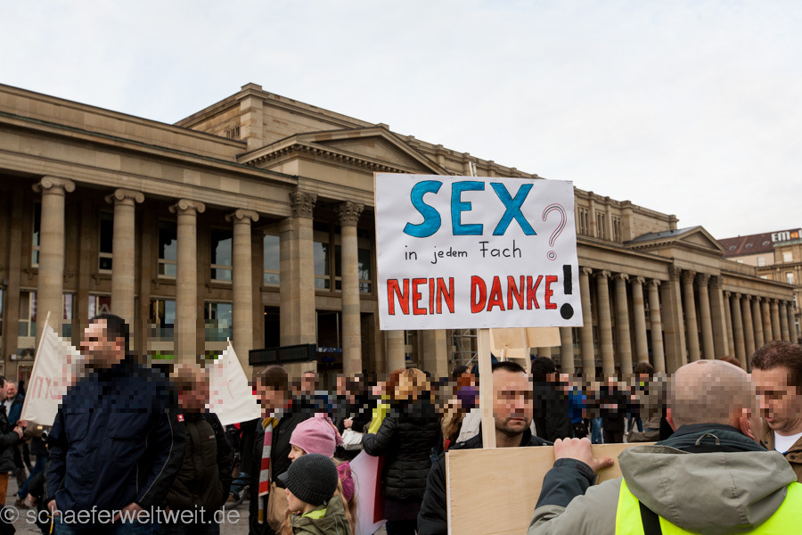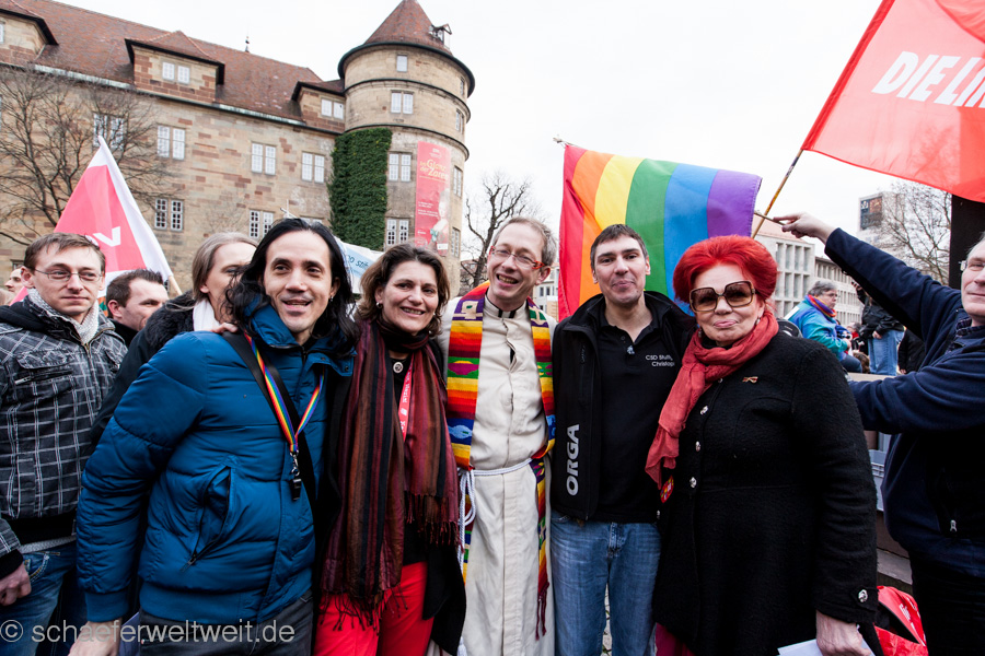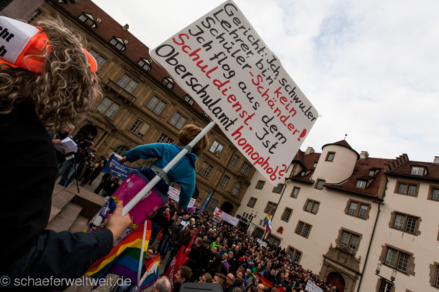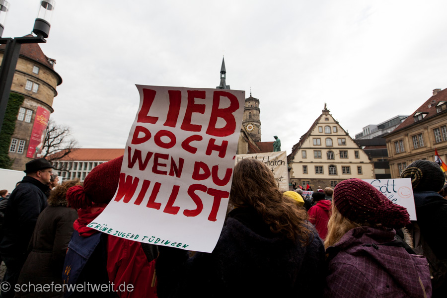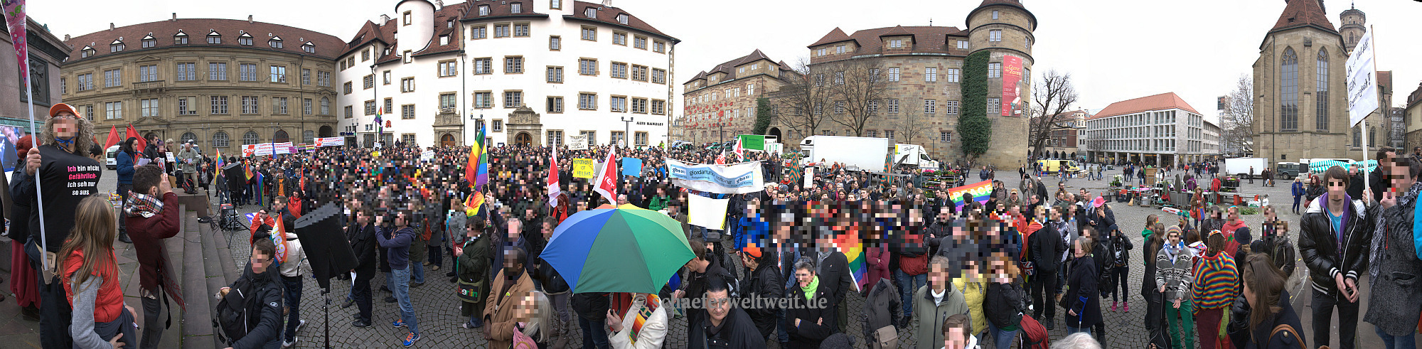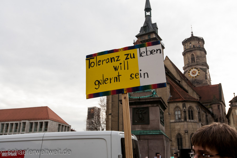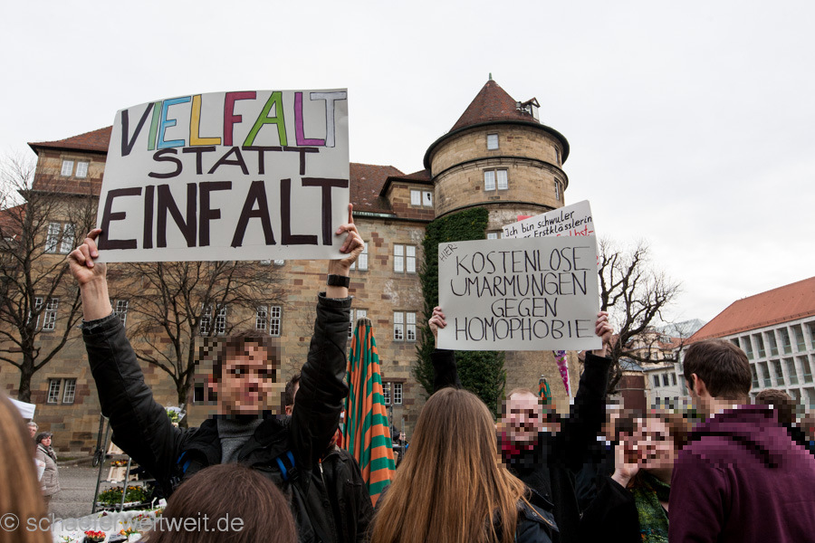 Am 01.02.14 riefen Gegner des Bildungsplanes (link/PDF) zu einer Demonstration auf dem Stuttgarter Schlossplatz auf. Die Kundgebung für die Vielfalt, fand promt als Antwort auf dem Nahe gelegenen Schillerplatz statt. Die Gegner des Bildungsplanes kritisieren die geplante Art wie Schüler an das Thema Sexualität heran geführt werden sollen. Nach den beiden Kundgebungen startete ein Demozug der Bildungsplan-Gegner Richtung Eckensee / Landtag. Schon sehr früh mischten sich aber unter die Rufe: „Schützt unsere Kinder!“ die Erwiderung: „Vor euch selbst!“ Die Demonstranten für die Vielfalt verhinderten mehrfach und letztlich erfolgreich den Demozug.