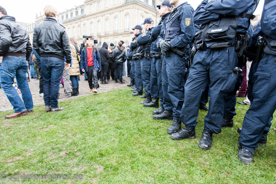 Die Demonstration stoppte schließlich in der Stauffenbergstraße zum stehen. Verwundert hat mich aber auch sehr, dass diese Demoroute überhaupt dort verlief! Soweit ich weis ist im Kunstgebäude zur Zeit der Landtag unter gebracht, im Umkreis von Landtagen herrscht aber normalerweise Demonstrationsverbot. (Definiert durch die sogenannte Bannmeile) Bei vielen Demonstrationen in der Vergangenheit hatte ich erlebt das deshalb schon sehr viele Menschen Probleme bekamen. Diesmal scheint dies der Polizei aber nicht wichtig gewesen zu sein. Die Demonstration gegen den Bildungsplan wurde schließlich gegen 16 Uhr in der Stauffenbergstraße abgebrochen und aufgelöst.