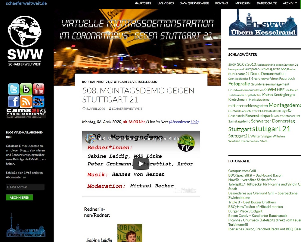 Natürlich fordern die aussergewöhnlichen Umstände nicht nur die Redner und Veranstalter herraus, nein auch die Teilnehmer müssen sich ein bishen mehr anstrengen als sonst um sichtbar gegen das Immobilienprojekt Stuttgart 21 zu demonstieren! Wer Aktiv teilnehmen will kann entweder live während der Demo in seinem bevorzugten Social-Media-Kanal seine Teilnahme selbst kund tun oder auch (kurze!) Videos oder Bilder als Grußworte an demoteam AT unser-park.de schicken!
