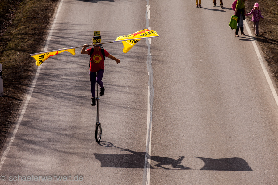 Am 29.04.13 wurde die Einfahrt am AKW Neckarwestheim für ca. 10 Stunden blockiert. Hier berichtet nun „Eichhörnchen Cécile“ über ihre Erfahrungen als Aktivistin bei dieser Blockadeaktion. Aus ihrer exponierten Position auf einem der 6m hohen Dreibeine (Tripod) hatte sie eine sehr gute Übersicht über die Ereignisse an der Einfahrt als ein PKW in die Blockade fuhr. „Der Fahrer, von der Hauptstrasse kommend, bremste zunächst vor der Demonstration. Statt aber wie seine Kollegen, einen anderen Weg zu suchen oder einfach außerhalb des AKW-Geländes zu parken, druckte er beim Einbiegen in die besetzte Zufahrtsstraße auf die Gaspedale. Er durchbrach die Materialblockade bestehend aus quer gespannten Transparenten, Tonnen und gelben Holz Xen (Widerstandssymbol). Er fuhr dabei ohne Rücksicht zu nehmen in die auf der Zufahrt befindlichen DemonstrantInnen. Ich sah aus der Spitze des 6 Meter hohen Tripods aus plötzlich ein Wagen auf mich zu fahren.“weiterlesen