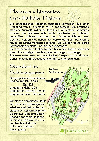 Die Menschen die sich am 30.09.2010 für diesen und andere Bäume eingesetzt haben wurden über zwölf Stunden lang von den Polizeitruppen mit Schlagstöcken, Pfefferspray und Wasserwerfern angegriffen und vertrieben. Ihr Demonstrationsrecht wurde mit Füßen getreten, ihr Anliegen war den Verantwortlichen egal. Die Platane wurde illegal gefällt, nicht nur aus Naturschutz Sicht sondern auch obwohl ein Fäll Verbot von Seiten des Eisenbahnbundesamtes (EBA) bestand und auch vor Ort bekannt war. Neben den dort aufgefundenen und angeblich evakuierten Europaweit streng geschützten Juchtenkäferlarven, wurde auch ohne Sinn und Verstand ein wichtiger Habitatbaum entfernt und damit unwiederbringlich in das Ökosystem der dort bestehenden Juchtenkäferpopulation eingegriffen.