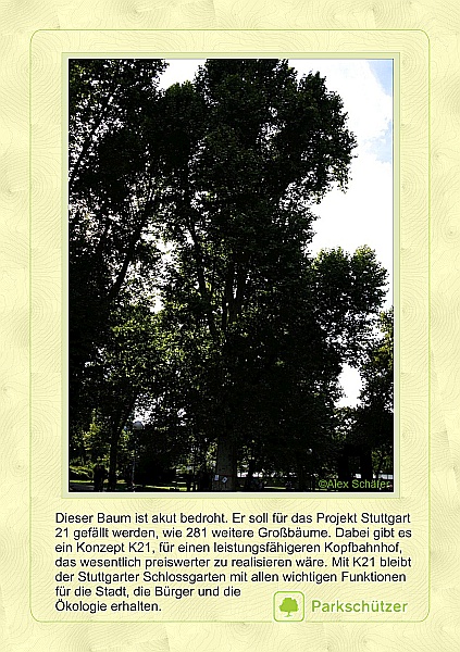 Bereits im Jahr 2010, als mit dem Beginn des Abrisses des Posttraktflügels des Hauptbahnhof klar wurde, dass die Deutsche Bahn wohl wirklich Fakten durch schlichte Zerstörung schaffen wollte, reifte in einigen Leuten die Idee, die Bäume im Mittleren Schlossgarten in Listen aufzunehmen.