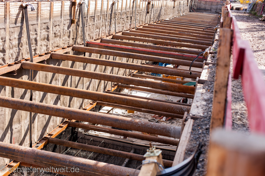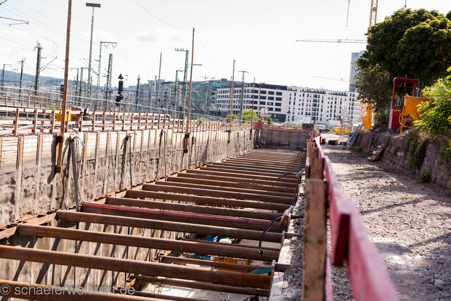 Man erkennt hier den Bau des neuen S-Bahntunnels vom HBF zur geplanten Haltestelle „Mittnachtstraße“ und zwar im Bereich zwischen „UFA-Palast“ und Wolframstraße. Wie über genau diesem Bereich sollte eigentlich die Baustraße und auch die SSB-Linie U12 gebaut werden. Bevor die Sbahn nicht fertig gebaut ist und bevor die Wolframstaße nicht verschwenkt ist kann dies aber gar nicht begonnen werden. Wie man sieht ist bisher noch nichts vom S-Bahn-Tunnel betoniert geschweige den an einen Deckel darüber auch nur zu denken.