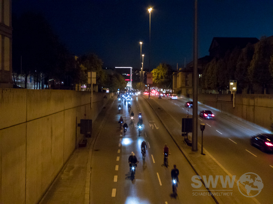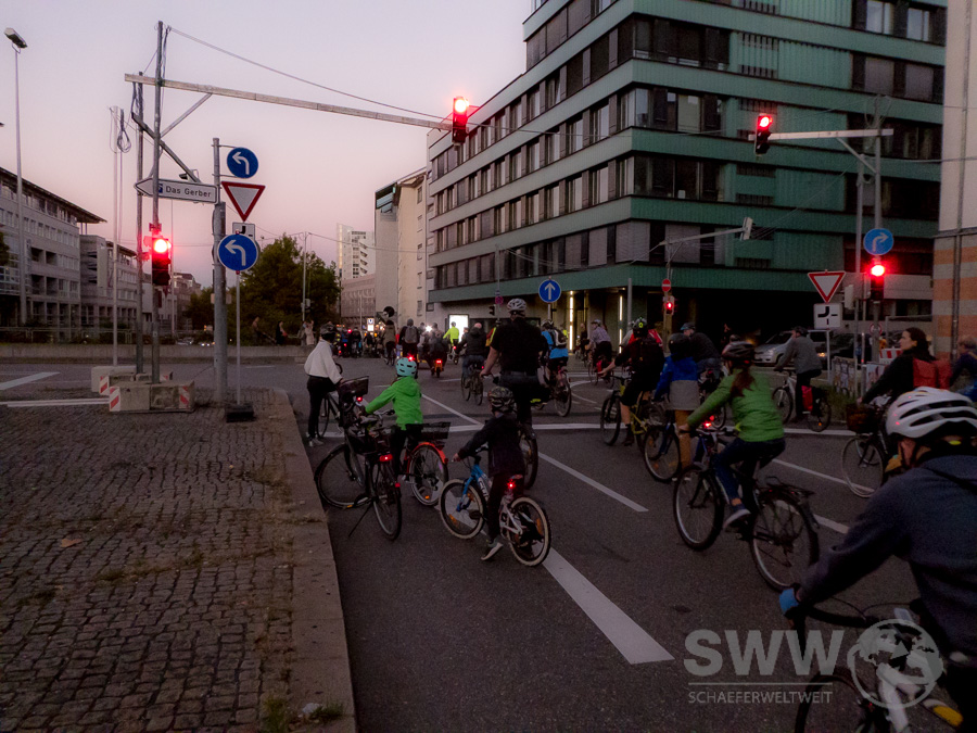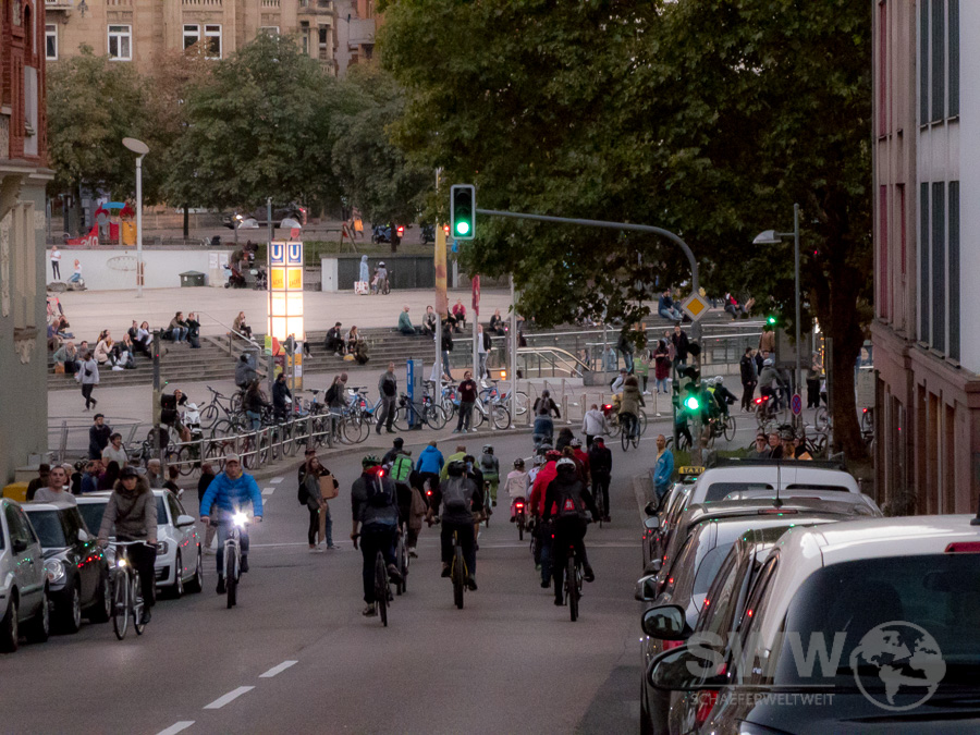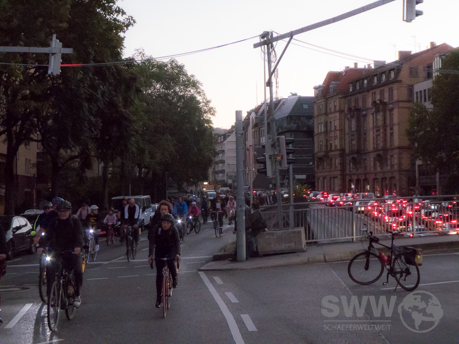 Jeden ersten Freitag im Monat treffen sich in Stuttgart einige Hundert Radfahrer zur Demo für das Fahrrad. Die Radfahrer erobern sich für kurze Zeit ihren Raum im Straßenraum zurück, selbst wenn dieser Freitag nun der Karfreitag ist.