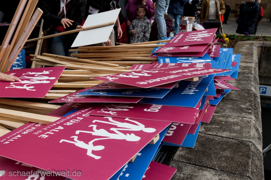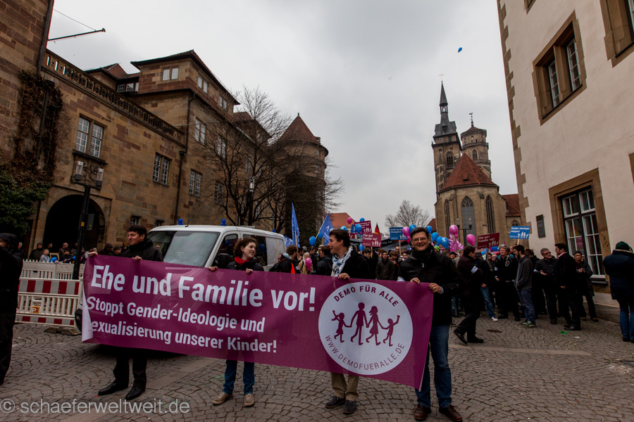 Letztes Wochenende trafen Sie sich wieder in Stuttgart. Diesmal unter dem Motto „Demo für Alle“. Es macht den Eindruck dies soll jetzt Monatlich passieren, evtl. noch öfter? Ich war die ersten beiden Male dort und machte mir ein Bild dieser Veranstaltung sowie auch der seit Anfang an schon statt findenden Gegenveranstaltungen. Schon immer schwankte ich dabei zwischen „Beachtung schenken“ oder „besser Ignorieren“. Diesmal entschied ich mich dazu dem nicht weiter groß aktive Beachtung zu schenken. Die meiner Ansicht nach völlig unpassenden Grußworte von Peter Hauk (CDU) und Hans-Ulrich Rülke (FDP), haben mir allerdings gezeigt dass dies jetzt wirklich bedenkliche Formen annimmt und nicht ignoriert werden darf. Was dann letztlich allerdings dem Fass den Boden ausschlägt ist die Reaktion von „Einzelhandel“ und „Stadt“ siehe STZ 08.04.14. Demo für Alle? Diffuse Ängste schüren und Politisch ausnutzen. weiterlesen →