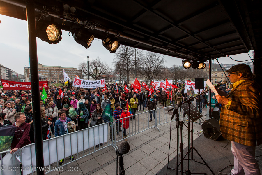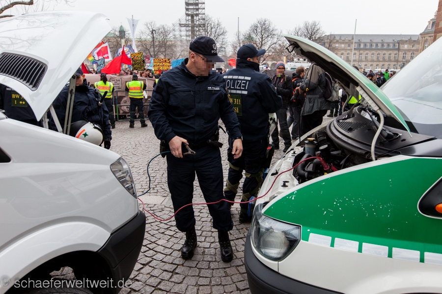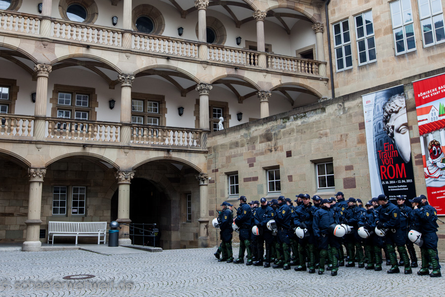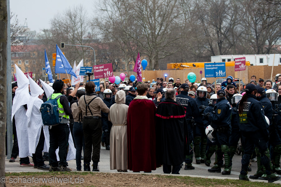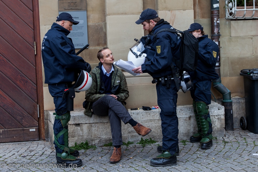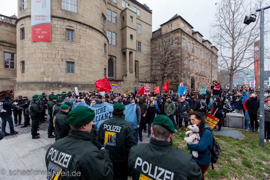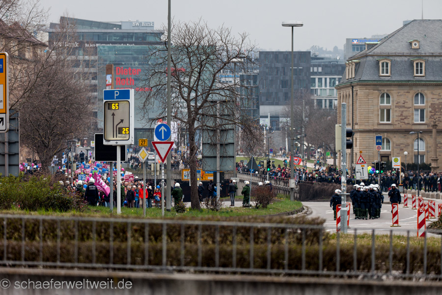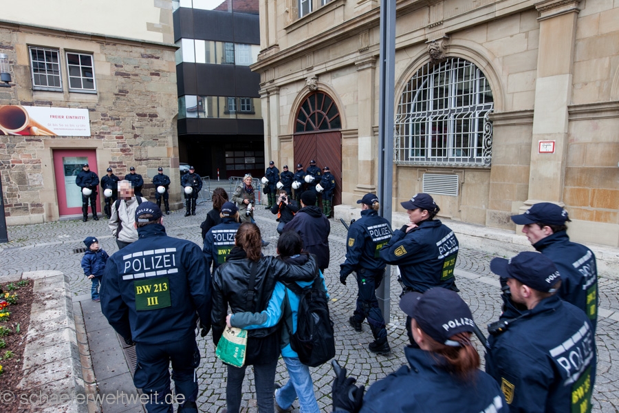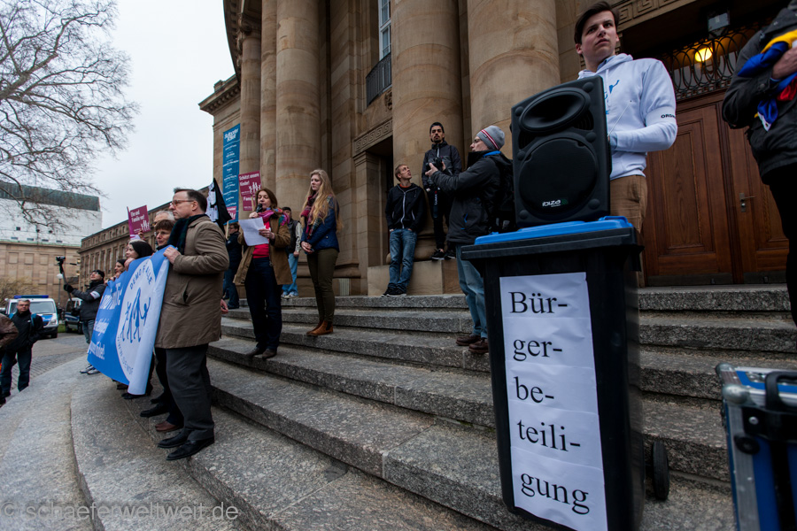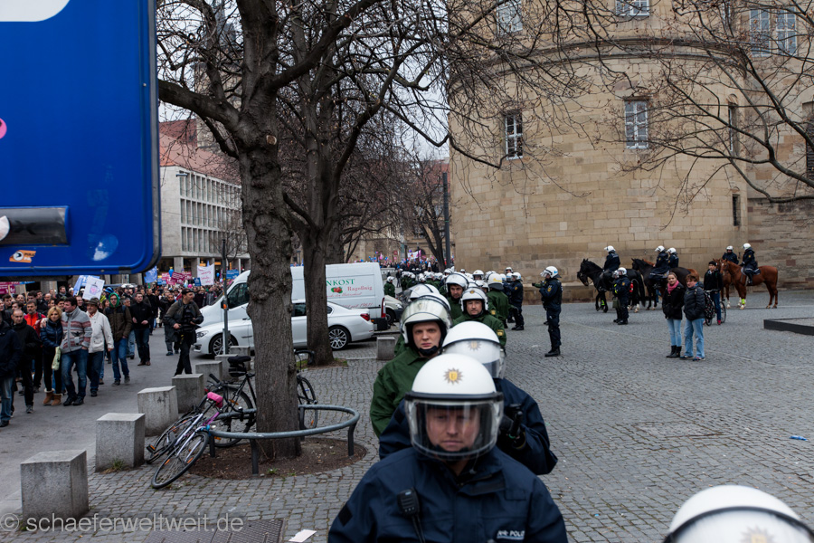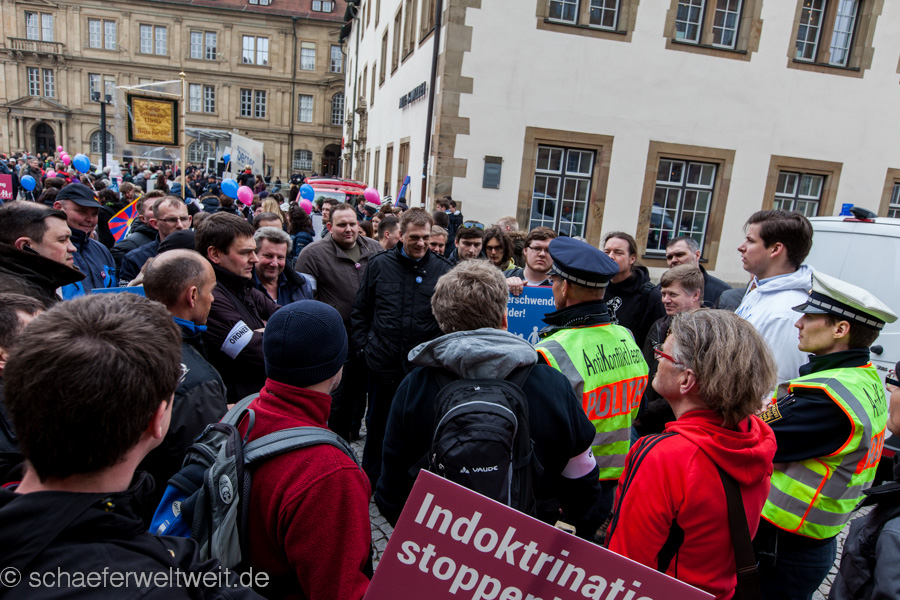 Zum mittlerweile sechsten Mal trafen sich „Gegner des Bildungsplanes“ (bei einer der letzten Demos von der Polizei als „Bildungsgegner“ bezeichnet) auf dem Schillerplatz. Geschützt von einer Unmenge von rund 700 Polizisten (immerhin ebenso viele wie 2/3 der Demoteilnehmer!) zogen diese dann vor das Staatstheater Stuttgart wo sie auf den Treppen der Oper ihre Schlusskundgebung abhielten.
