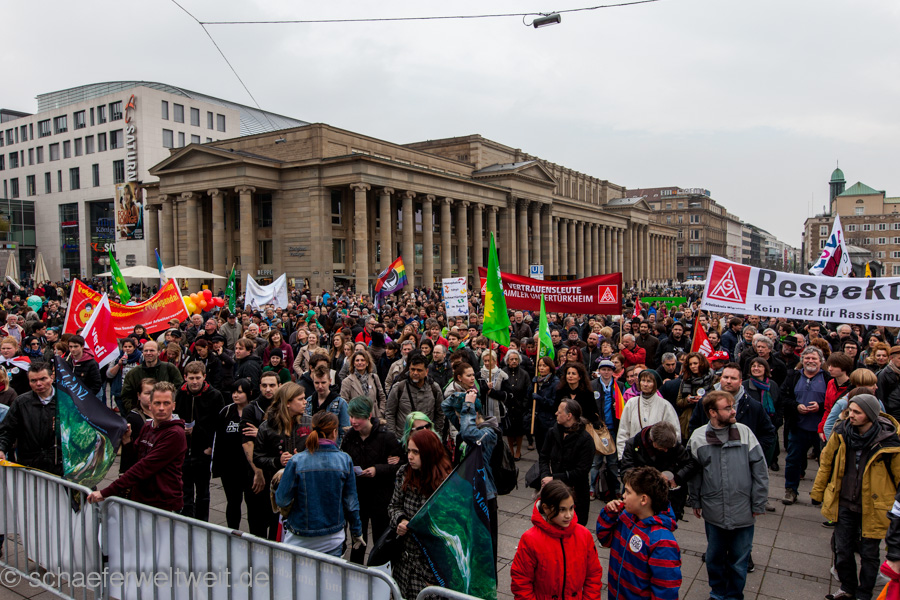 Eine Gegenveranstaltung unter dem Motto „Stuttgart ist und bleibt bunt“ fand gleichzeitig organisiert von „No-Pegida Stuttgart“ und dem Verein „Die Anstifter“ auf dem Schlossplatz statt. Während dem Demozug der „Bildungsgegner“ waren einzelne Gegneraktionen zu sehen.